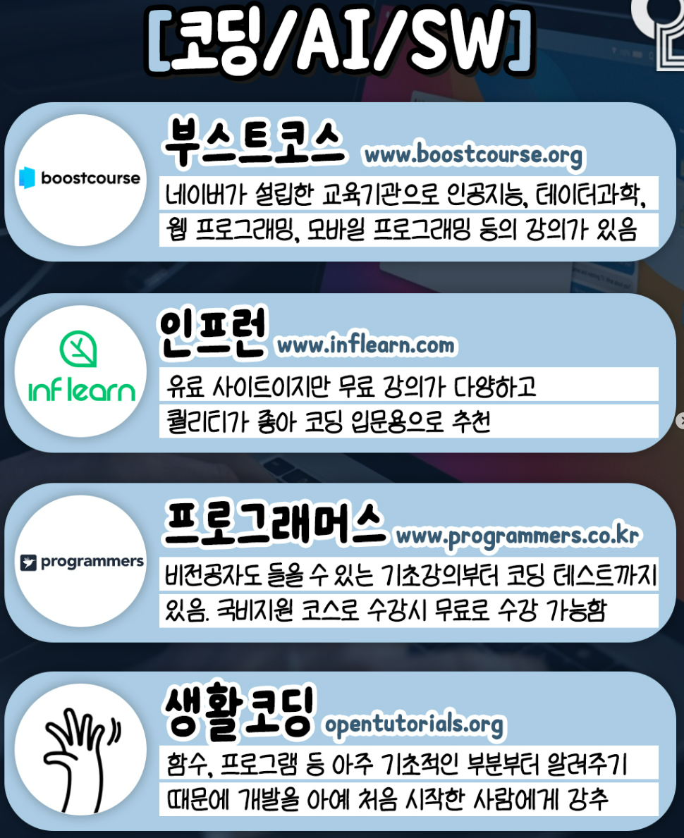 안녕하세요 알두쓸모입니다. 2025년 새해가 밝았습니다. 2025년 새해 목표로 새로운 자격증 취득을 목표로 하신 분들이 많으실 텐데요, 관련해서 도움을 받을 수 있는 무료 사이트들을 안내드리고자 글을 작성하게 되었습니다. 자격증, 코딩, AI, SW, 창업, 마케팅, 대학강의, 자기계발, 어학, 영상, 직장, 금융 등 다양한 테마로 무료 강의가 많이 있습니다. 아래의 카테고리 참고해 주셔서, 다양한 사이트에서 많은 지식 습득하시면 좋겠습니다. 2025년에는 모두 이루고자 하시는 소망들 이루셨으면 좋겠습니다.