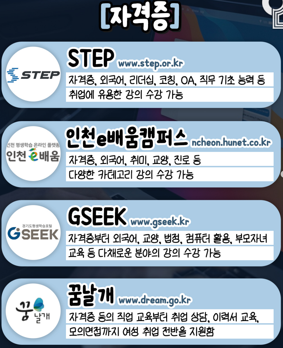 자격증, 외국어, 리더십, 코칭, OA, 직무 기초 능력 등 취업에 유용한 강의 수강 가능