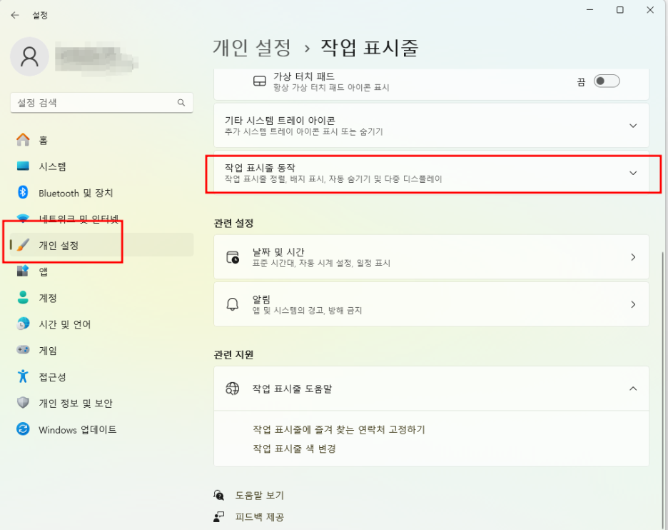 작업표시줄 항목을 선택하면 작업표시줄 관련된 대부분 세팅을 여기에서 할 수 있습니다. 다른 옵션도 여기에서 확인해보세요. 지금 우리가 원하는 것은 어색한 중앙 정렬입니다.
