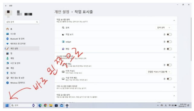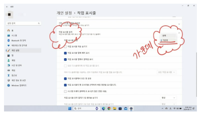 복잡한 작업표시줄을 단순하게 만들기 위해서 모두 껐습니다.