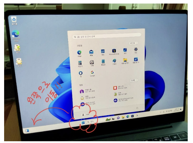 작업표시줄에 시작 버튼이 정중앙에 있는 겁니다. 왼쪽에 있는 게 익숙한 사람들에게 강요하지 말라고~~ 그래서 찾아낸 방법입니다. 저만 따라 하세요. 익숙하게 왼쪽 정렬 이동 맞춤 가능합니다.