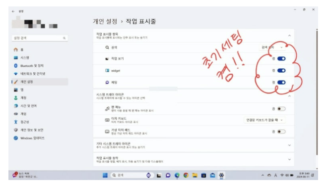 개인적으로 아래 표시된 작업 보기, 위젯, 채팅 사용하지 않습니다. 그런데 초기 세팅은 켬으로 되어 있어요.