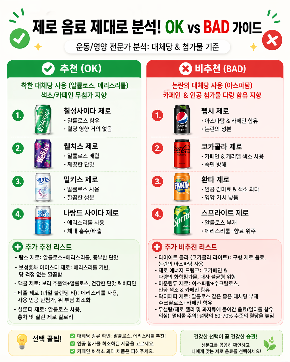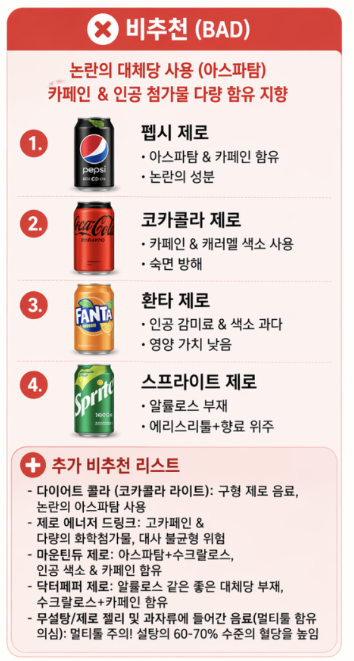 - 제로 에너지 드링크: 고카페인 + 첨가물 많음