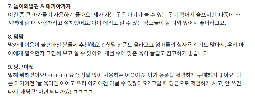 - 맘맘: 맘카페가 가끔 피곤할 때 있잖아요? 여긴 핫딜 정보나 실사용 후기 위주라 깔끔해요. 개월수별 꿀팁 보기도 좋고요.