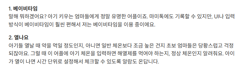 - 열나요: 초보 엄마들은 아기 열나면 멘붕 오잖아요. 약을 먹여야 할지 말지 고민될 때 체온을 입력하면 가이드를 줘요. 시간별로 열 체크 알람도 오니까 밤샘 간호할 때 진짜 든든해요.
