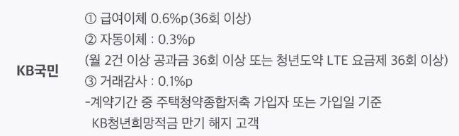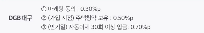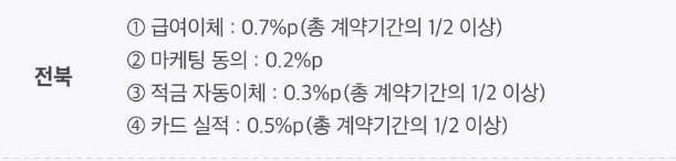 ②우대금리는 소득 수준이 기준보다 낮은 청년에게 우대금리를 적용하는 것입니다. 모든 은행은 0.5%p로 동일합니다. ▲총 급여 2,400만 원 이하 ▲종합소득세 과세표준에 추가되는 종합소득은 1,600만 원 이하 ▲연말정산되는 사업소득은 1,600만 원 이하입니다.