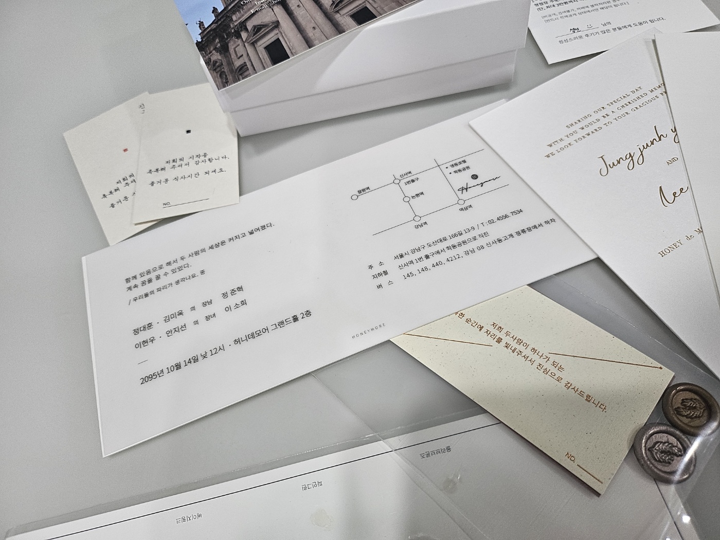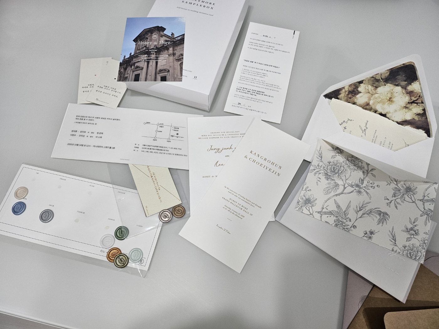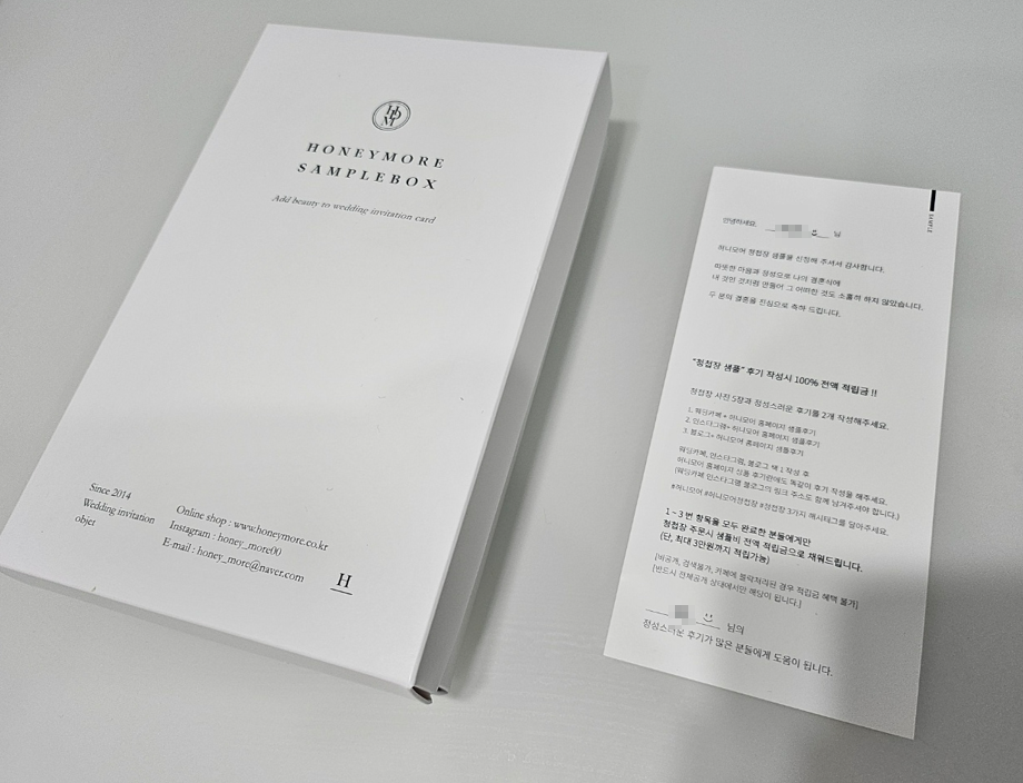 다른 곳과 다르게 허니모어 청첩장은 유료로 진행합니다. 그래서 더 특별하고 가치있는 것 같아요. 실제로 무료료 샘플을 받아볼 수 있는 곳과 퀄리티 차이가 상당하더라구요. 그래서 유료로 샘플을 받아봐도 전혀 아쉽지 않았어요. 편지지를 고르는 것도 보다 좋은 것을 고르듯이 청첩장도 더 좋은 청첩장으로 하객분들께 초대를 하고 싶었습니다.