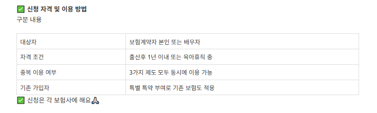 | 자격 조건 | 출산후 1년 이내 또는 육아휴직 중 |