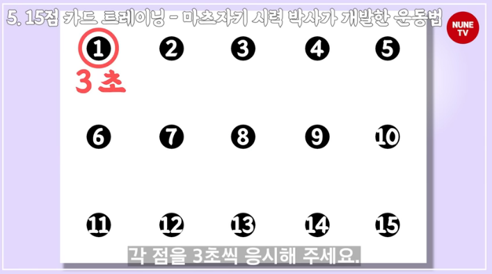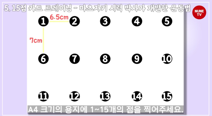 마츠자키 시력 박사가 개발한 15점 카드 트레이닝 만드는 방법입니다. 간단하게 만들 수 있으며 수시로 운동을 해주면 정말로 시력이 좋아진다고 합니다. 위 자료를 참고하여 쉽게 만들고 자주 사용하셔서 눈을 단련하시면 좋겠습니다.