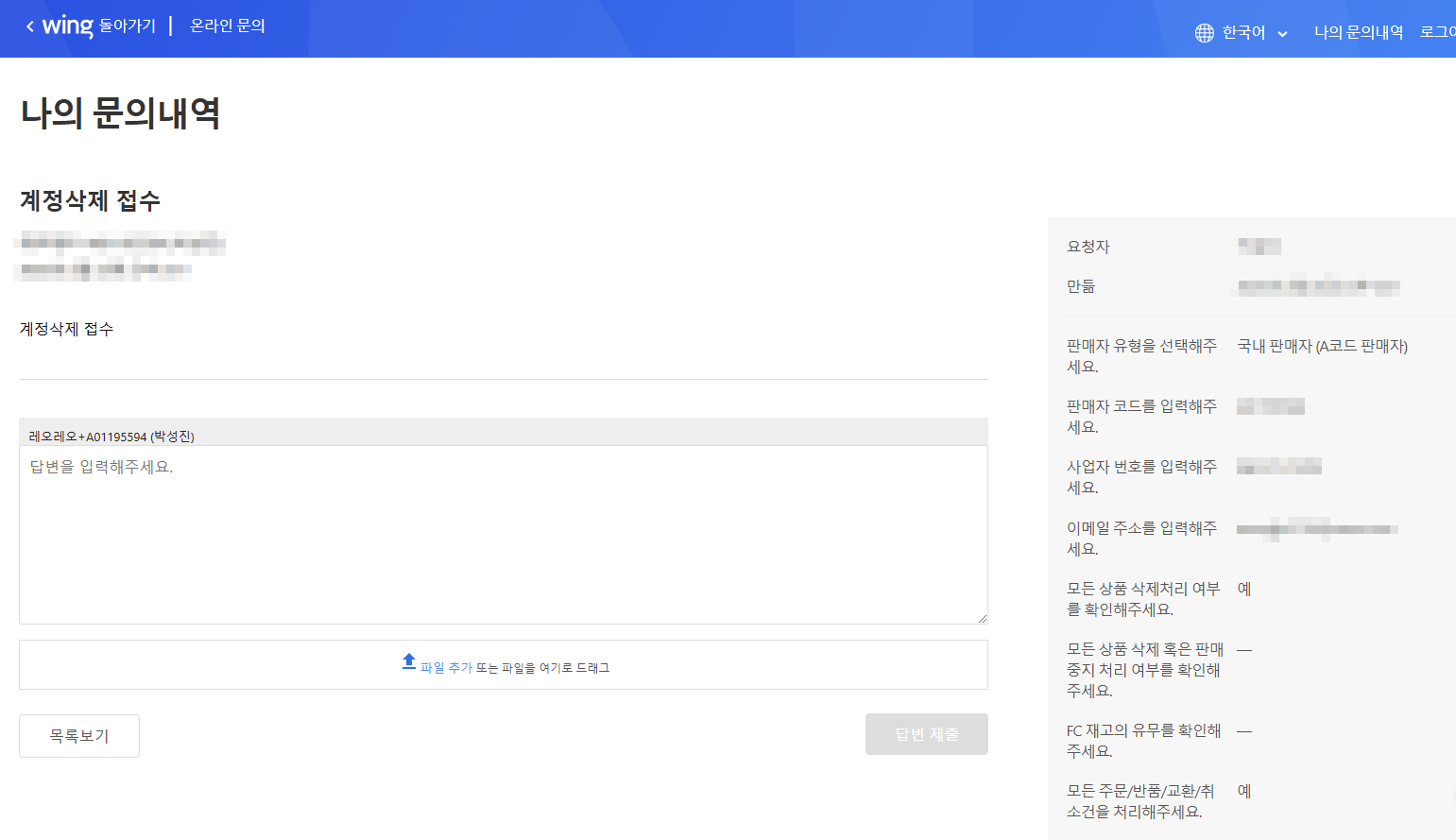 판매/배송 중인 상품이 있거나, 미답변 문의 내역이 있거나, 취소/반품/교환 내역이 있으면 쿠팡 윙 탈퇴 신청이 취소될 수 있으니, 참고하셔서 놓친 내역이 없는지 확인해야 합니다.