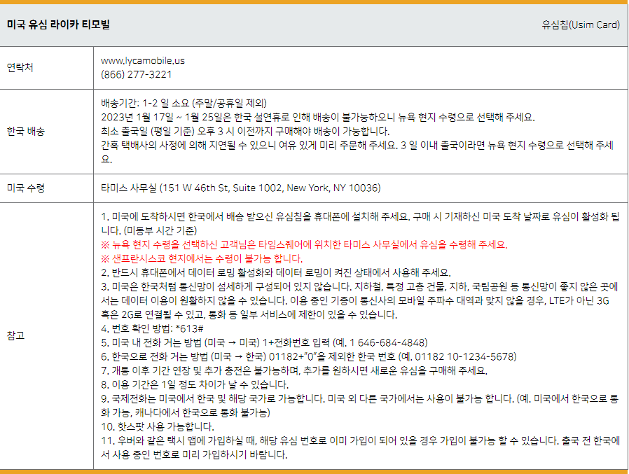 ※ 뉴욕 현지 수령을 선택하신 고객님은 타임스퀘어에 위치한 타미스 사무실에서 유심을 수령해 주세요.