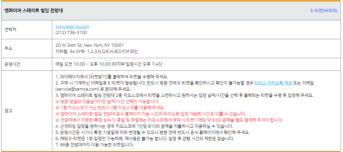※ 엠파이어 스테이트 빌딩 전망대 공식 홈페이지 가능 시간과 타미스로 입장 가능한 시간은 다를 수 있습니다.