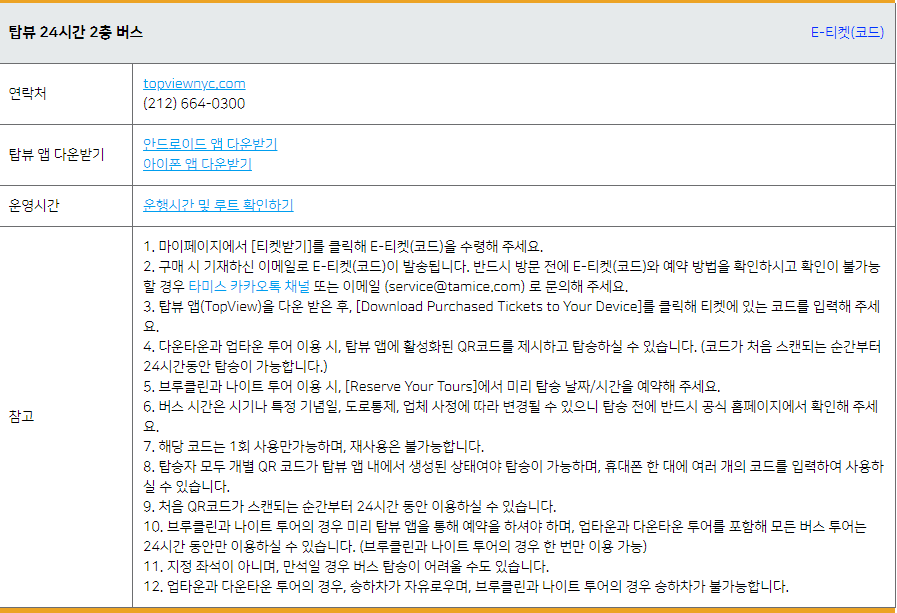 10. 브루클린과 나이트 투어의 경우 미리 탑뷰 앱을 통해 예약을 하셔야 하며, 업타운과 다운타운 투어를 포함해 모든 버스 투어는 24시간 동안만 이용하실 수 있습니다. (브루클린과 나이트 투어의 경우 한 번만 이용 가능)