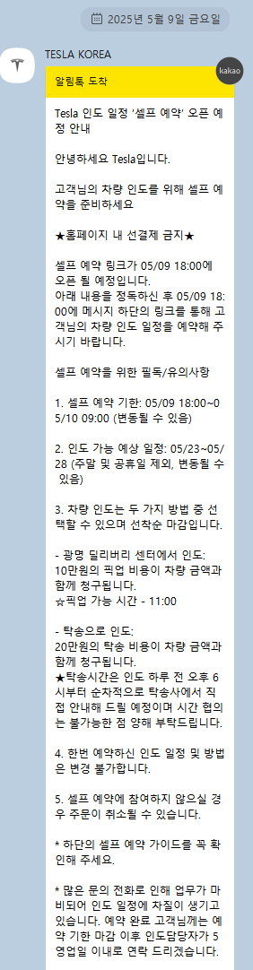 그렇게 언제 테슬라가 출고될지 시간을 기다리고 있던 찰나에 2025-05-09일에 카톡이 왔습니다.