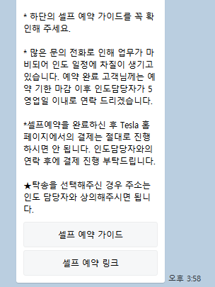 당일에 예약을 알려주고 총 3번의 연락이 왔었습니다. 저와 같이 테슬라 모델 Y 주니퍼를 계약하신 분들은 언제 이런 알림톡이 올지 모르니, 미리 준비하셔서 잘 대응하시고 원하시는 날짜에 차량 인도 예약을 하시면 좋을 것 같습니다
