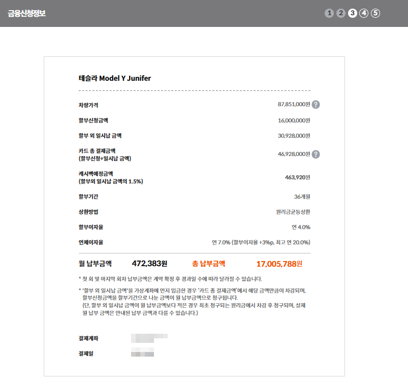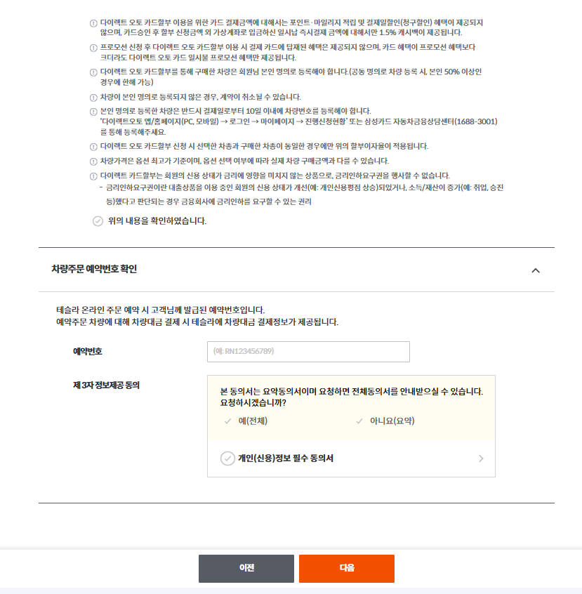안녕하세요 알두쓸모입니다. 오늘은 테슬라 모델 y 주니퍼를 계약 진행하면서, 인도를 받기 전에 진행해야하는 결제에 대한 글을 작성하도록 하겠습니다. 테슬라의 결제는 삼성카드로만 가능하며, 테슬라를 구매하실분이라면 삼성카드를 미리 발급 하시는게 좋습니다. 선납금을 하면 캐시백을 받을 수도 있어서, 테슬라 구매하실분은 아래 블로그 글을 참고하시면 좋을 것 같습니다. 아래의 삼성카드 다이렉트 오토 링크를 통해 할부 결제를 진행할 수도 있고, 일시불 결제를 진행할 수 도 있습니다. 저는 할부 결제로 진행하였고, 진행한 내용은 아래 사진과 같이 남겼으니 참고하시어 따라 진행하시면 좋을 것 같습니다.