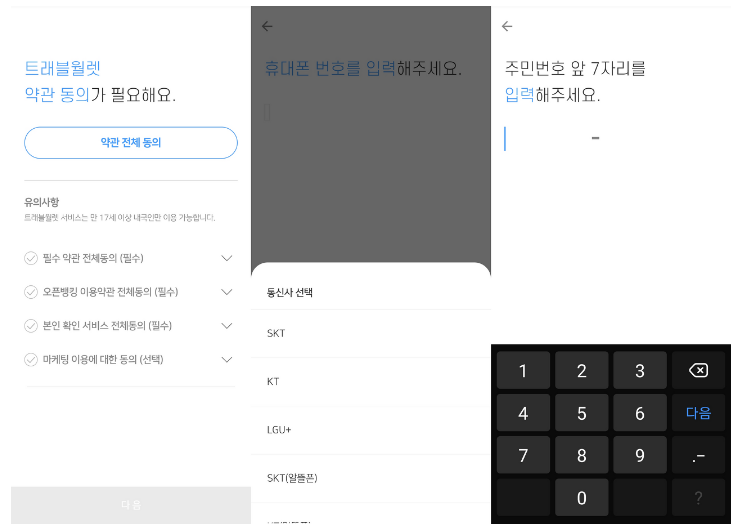 1. 트래블월렛 약관 동의 -> 개인 연락처 정보 입력 -> 주민등록번호 입력
