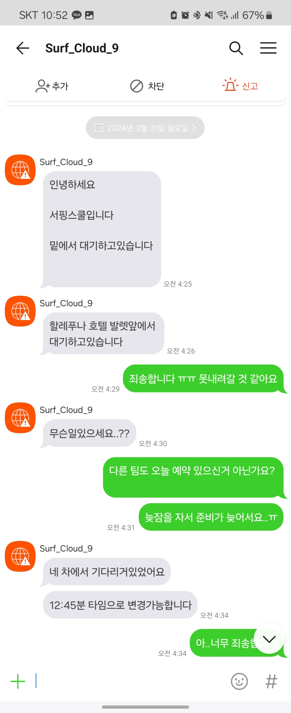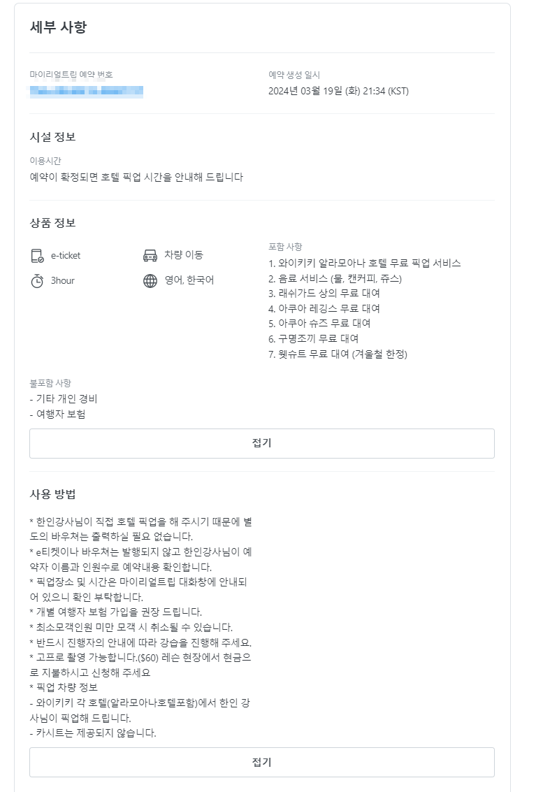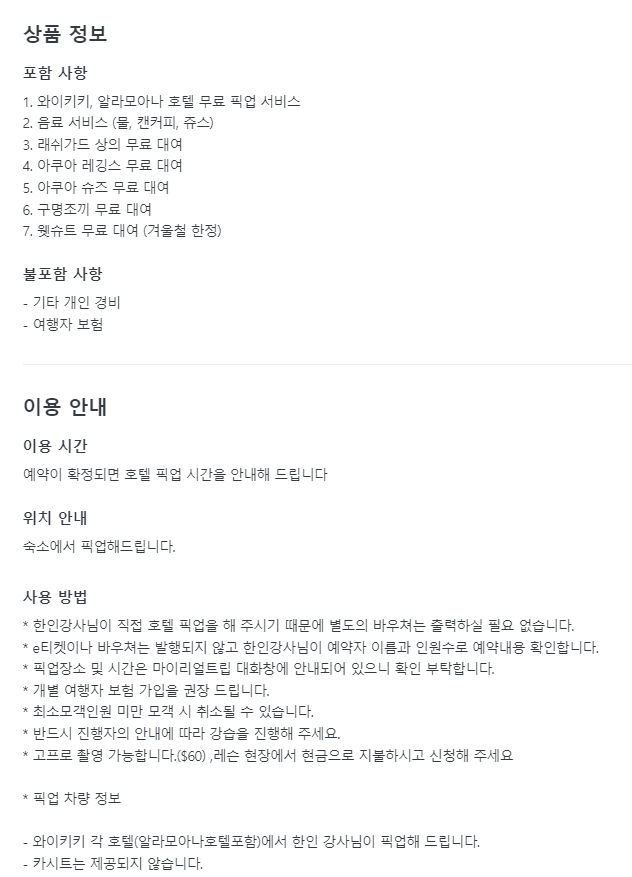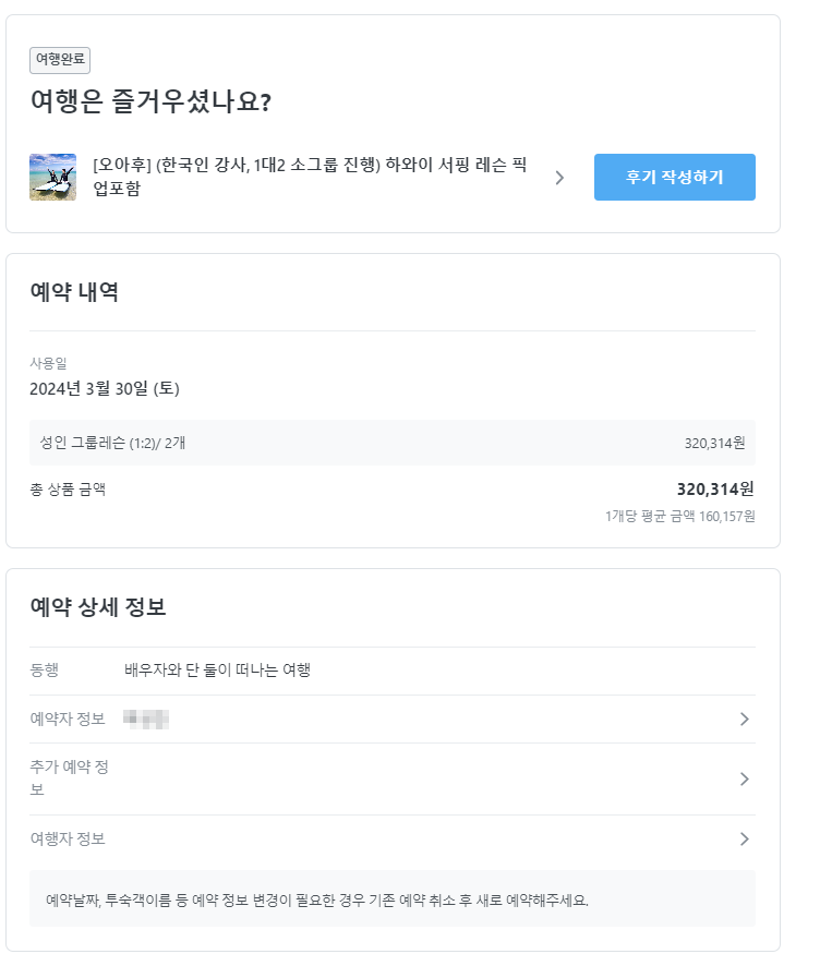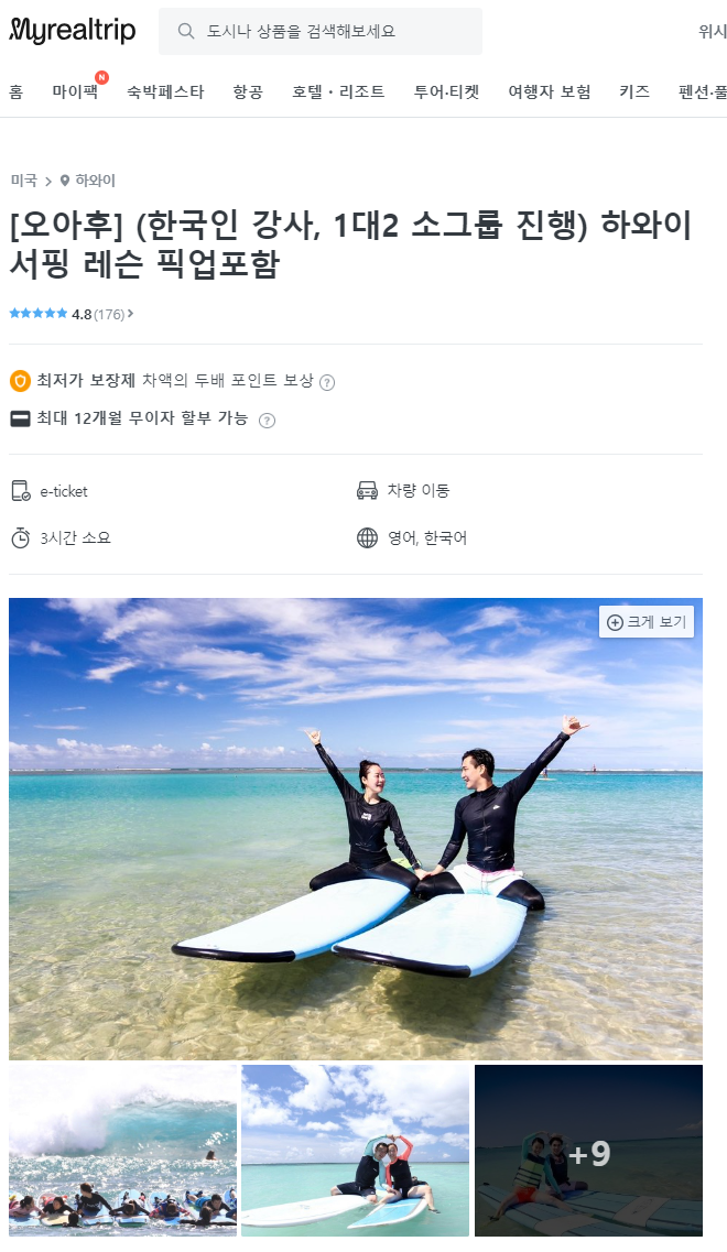 예약은 마이리얼트립에서 진행했었습니다. 후기도 많고 평점도 4.8로 높고 좋아서 매우 기대가 되었습니다. 시차를 고려하지 않고 하와이 도착 둘째 날에 서핑을 계획하였는데 시차를 무시한 나머지 결국에는 늦잠을 자고 말았습니다... 하지만 사장님께서 예약시간을 변경해 주셔서... 너무나 감사하게도 서핑을 경험해 볼 수 있었습니다. 다시 한 번 너무 감사드립니다.