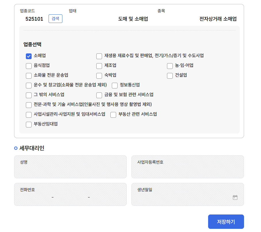 사업자등록번호를 확인하여, 다른 정보들에 대해서 모든 값을 채운 뒤, 저장하기를 눌러 다음으로 이동합니다.