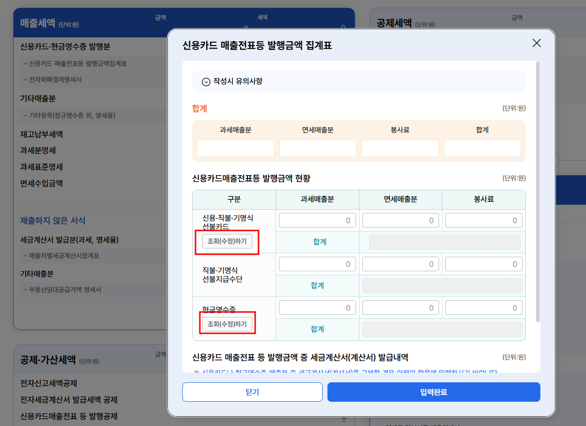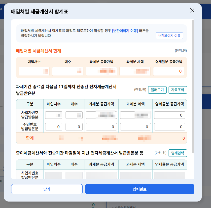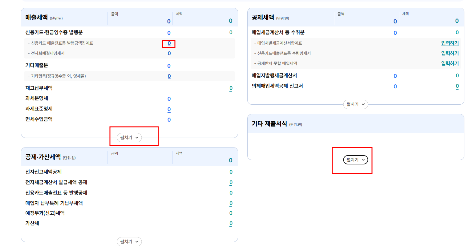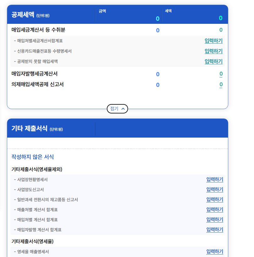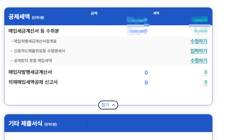 저장하기를 눌러서 다음으로 이동합니다. 다음 페이지에서는 매출세엑 , 공제세액 , 공제, 가산세액에 대해서 입력 및 데이터 등록을 하게 됩니다.