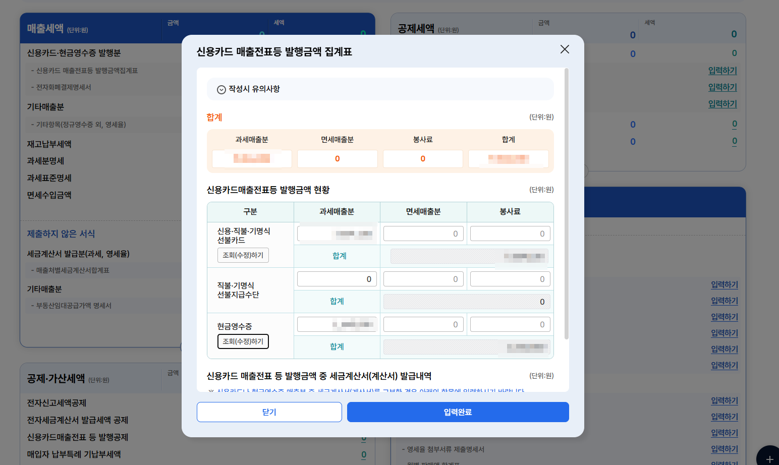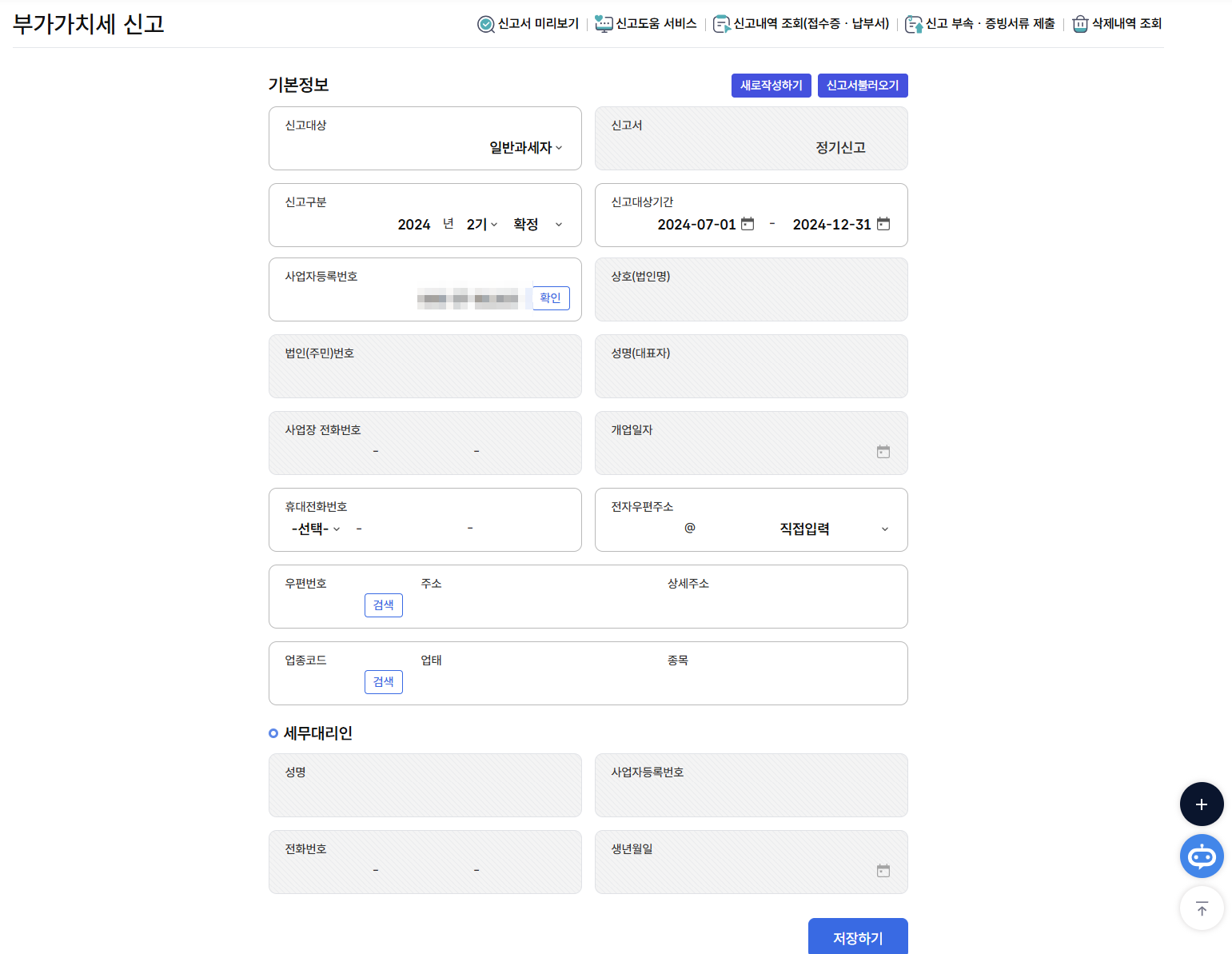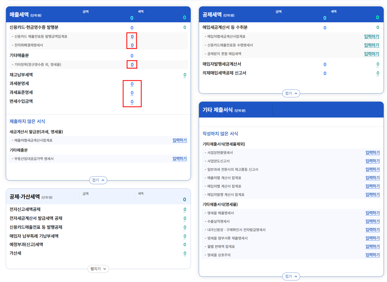 저장하기를 눌러서 다음으로 이동합니다. 다음 페이지에서는 매출세엑 , 공제세액 , 공제, 가산세액에 대해서 입력 및 데이터 등록을 하게 됩니다.