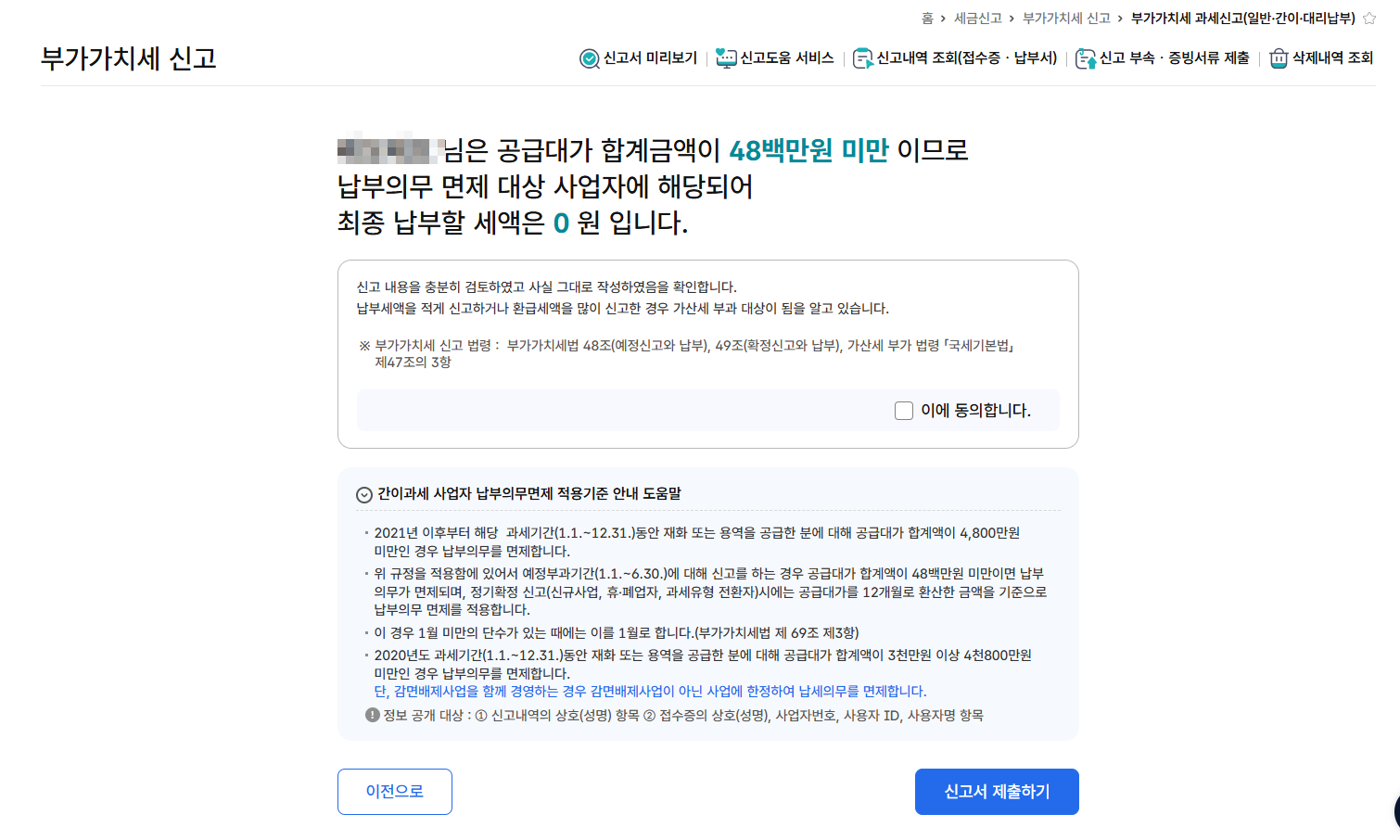 최종 금액을 확인하기 이대로 신고하기를 클릭합니다.