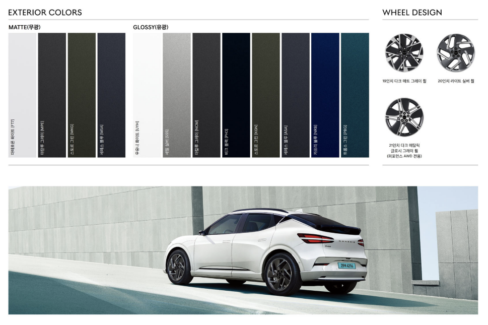 제네시스 2025년 GV60의 스탠다드 모델, 퍼포먼스 모델이 있음을 알 수 있습니다.