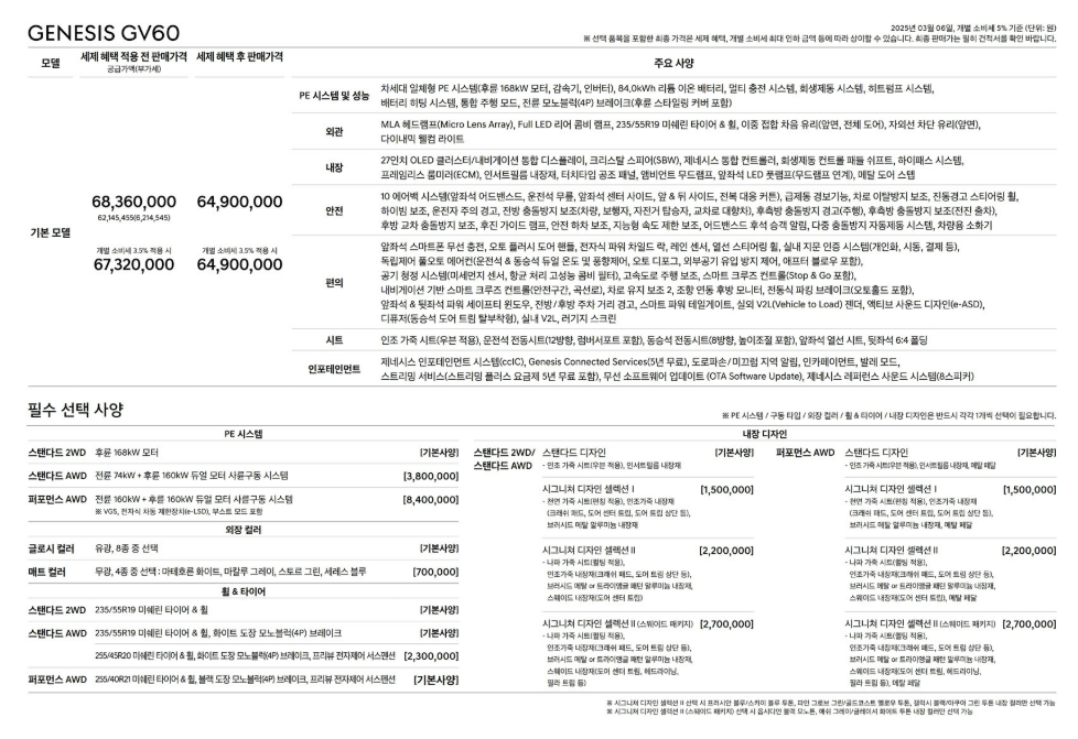 제네시스 2025년 GV60 옵션표 필수 선택 사양