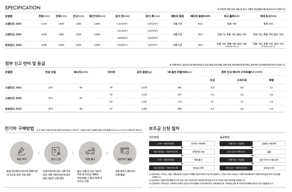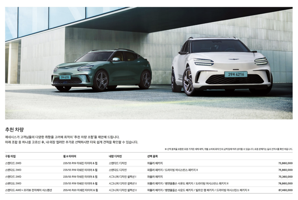 제네시스 2025년 GV60의 스탠다드 모델, 퍼포먼스 모델이 있음을 알 수 있습니다.