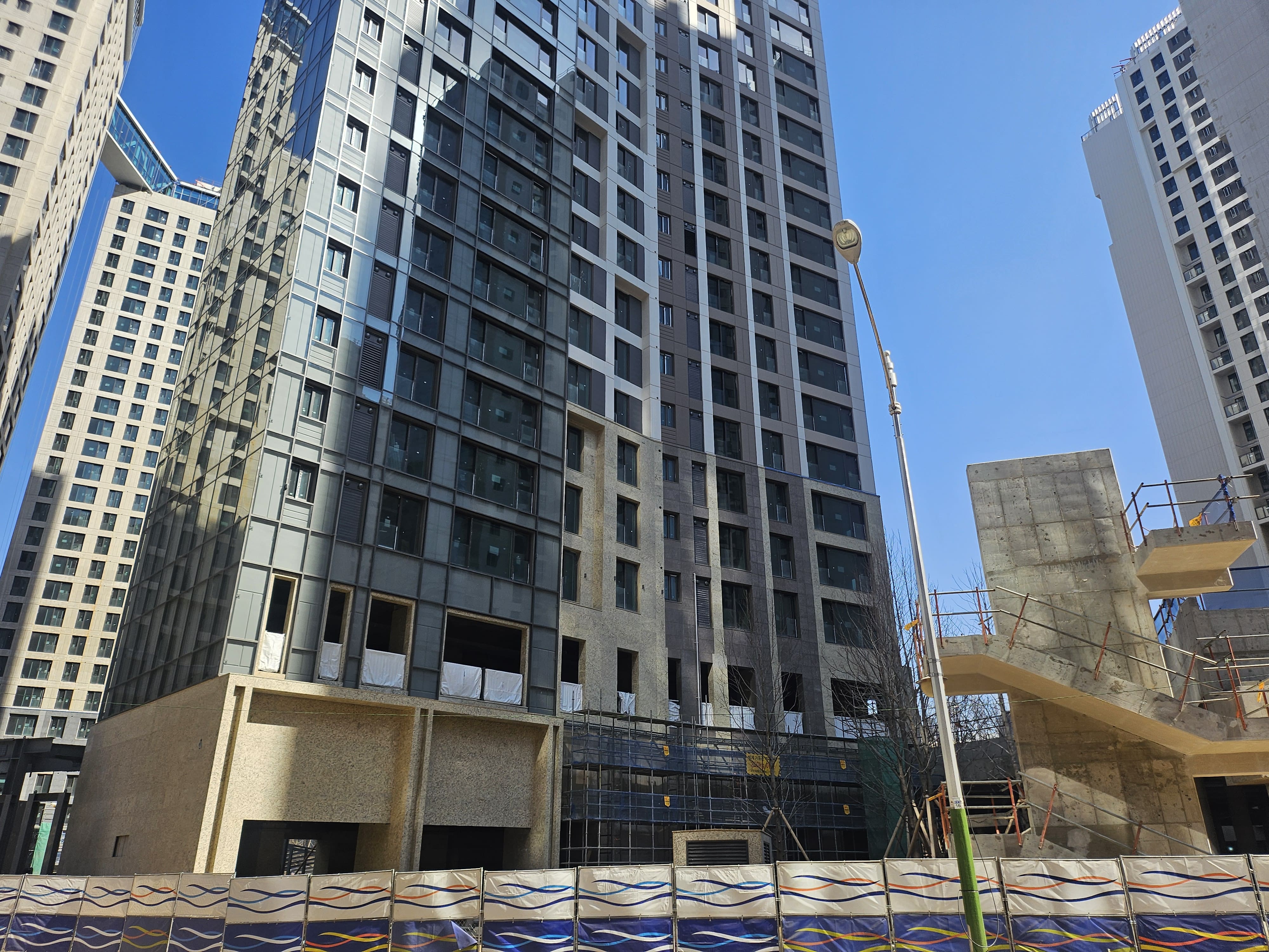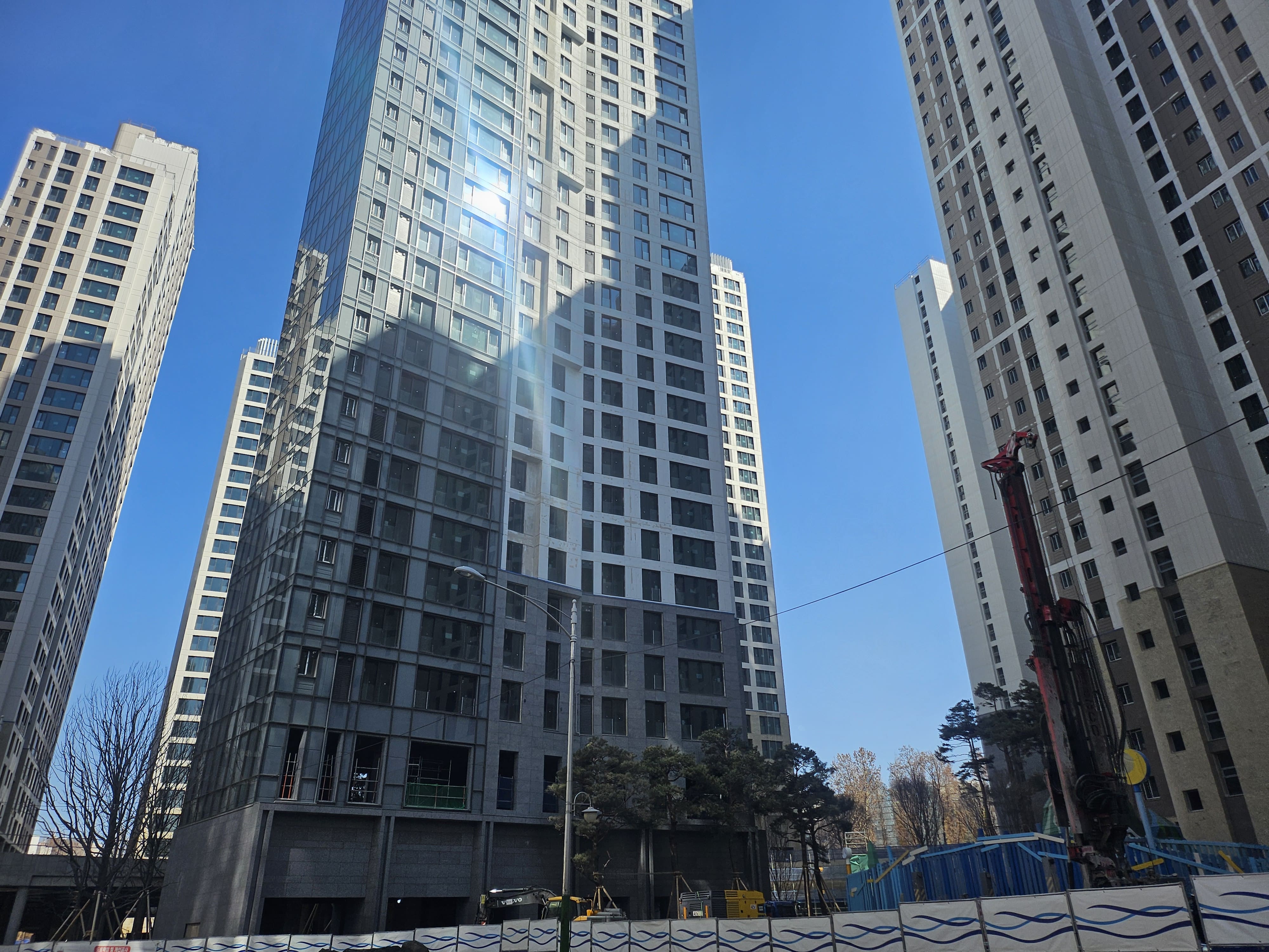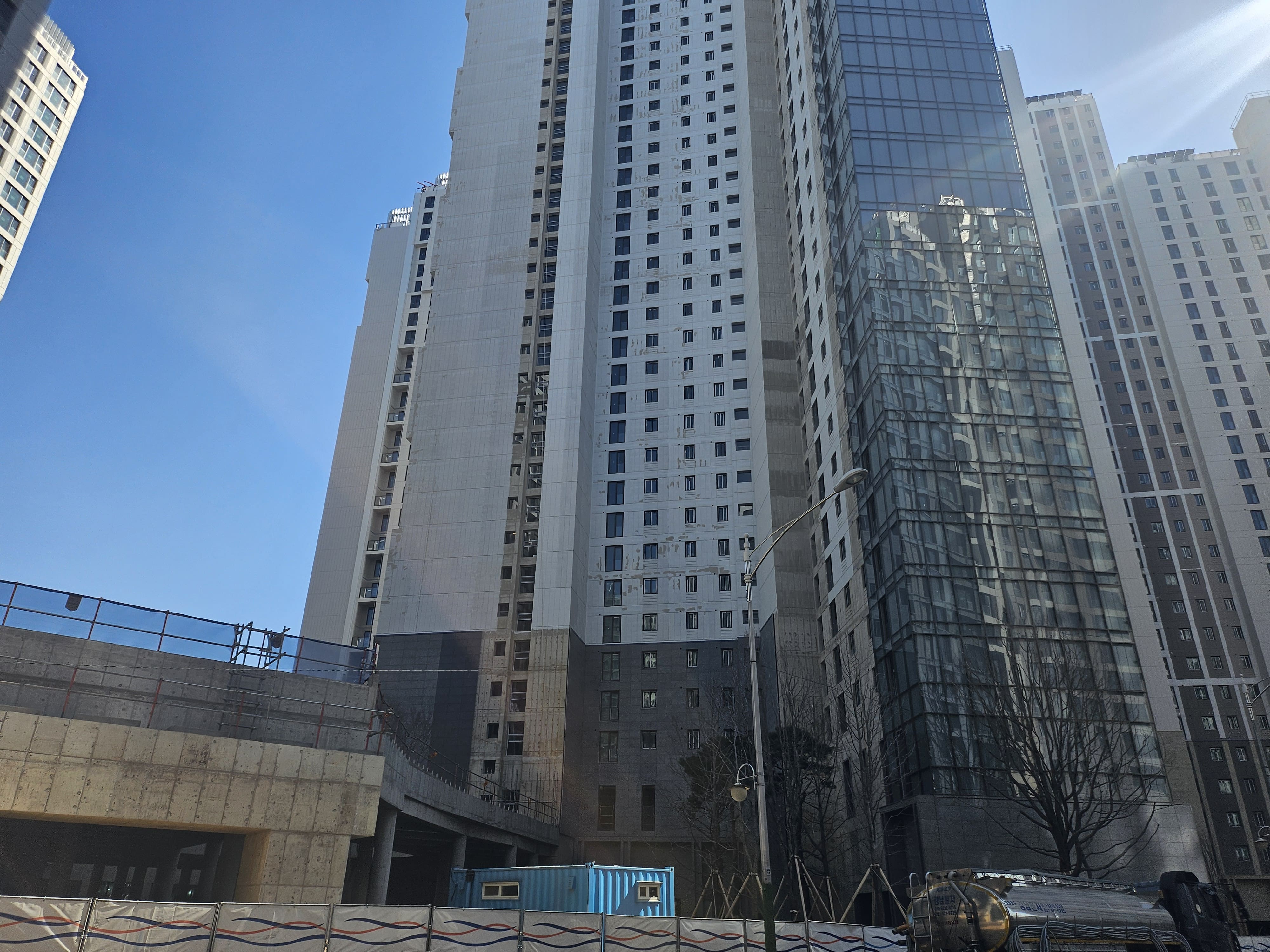 대부분의 동들이 외벽공사는 완료되어서 커튼월이 완성된 것을 확인하였습니다. 외벽 외칠도 완료되어서, 상당히 고급스러운 아파트임을 알 수 있었습니다.