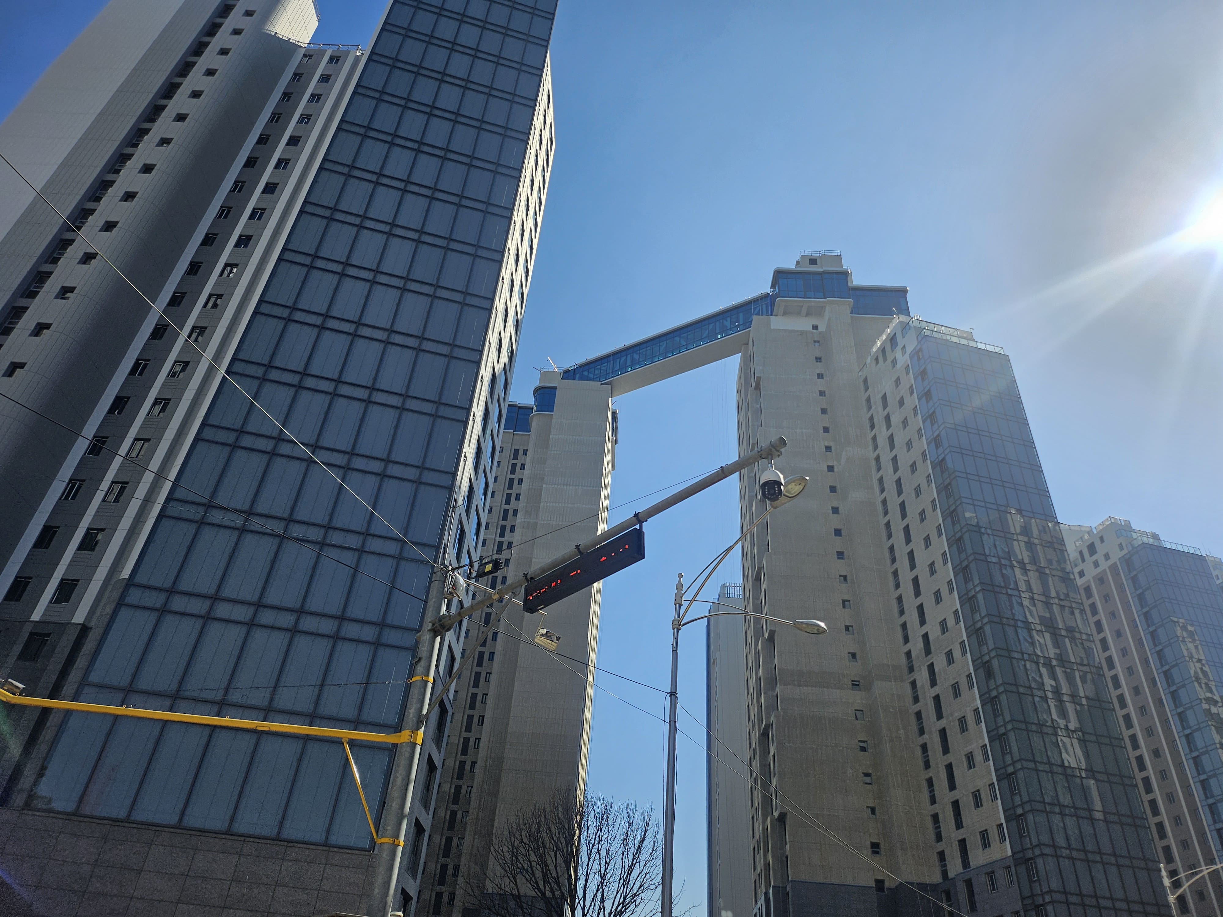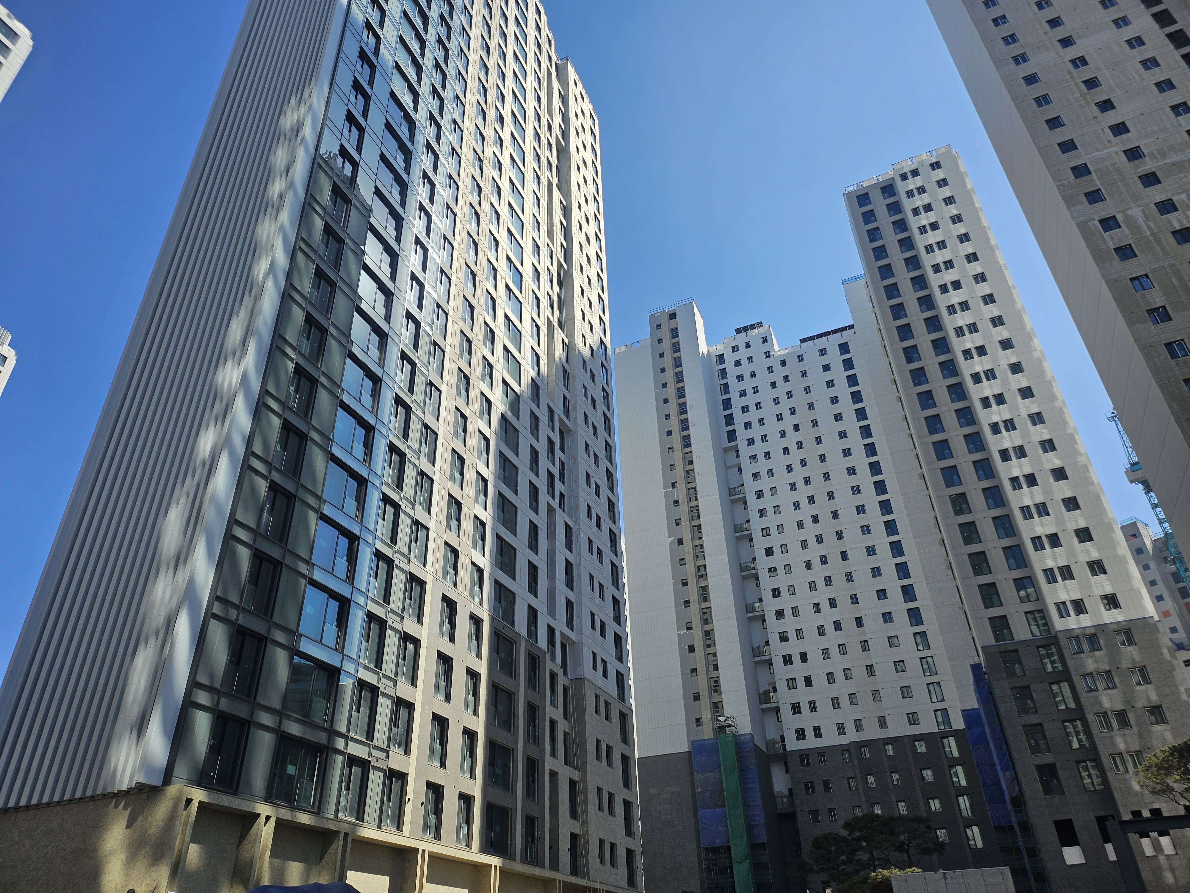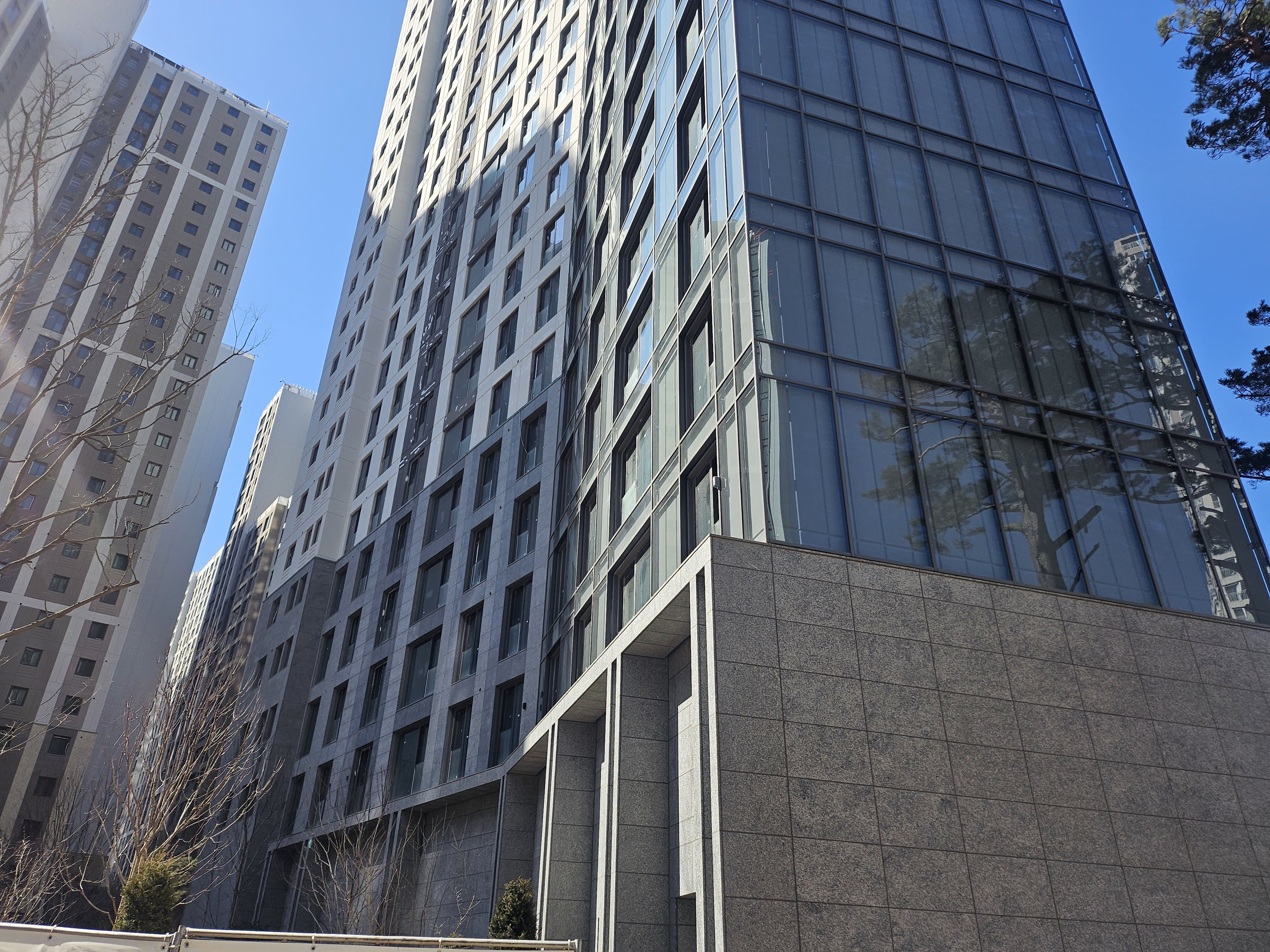 대부분의 동들이 외벽공사는 완료되어서 커튼월이 완성된 것을 확인하였습니다. 외벽 외칠도 완료되어서, 상당히 고급스러운 아파트임을 알 수 있었습니다.