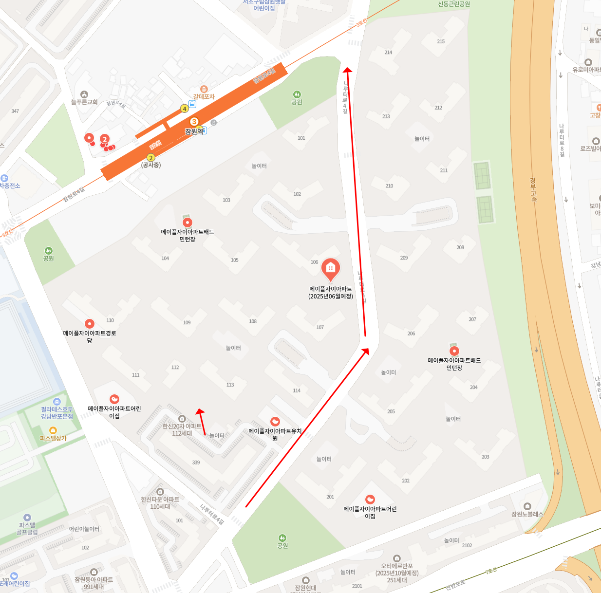 메이플자이아파트 유치원부터 시작해서, 메이플자이 201동, 메이플자이 205동, 메이플자이 206동, 메이플자이 209동, 메이플자이 210동 메이플자이 213동, 메이플자이 114동, 메이플자이 107동, 메이플자이 106동, 메이플자이 102동을 지나가는 순서로 임장을 다녀왔습니다.