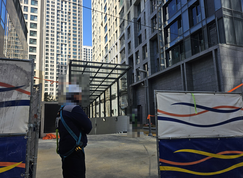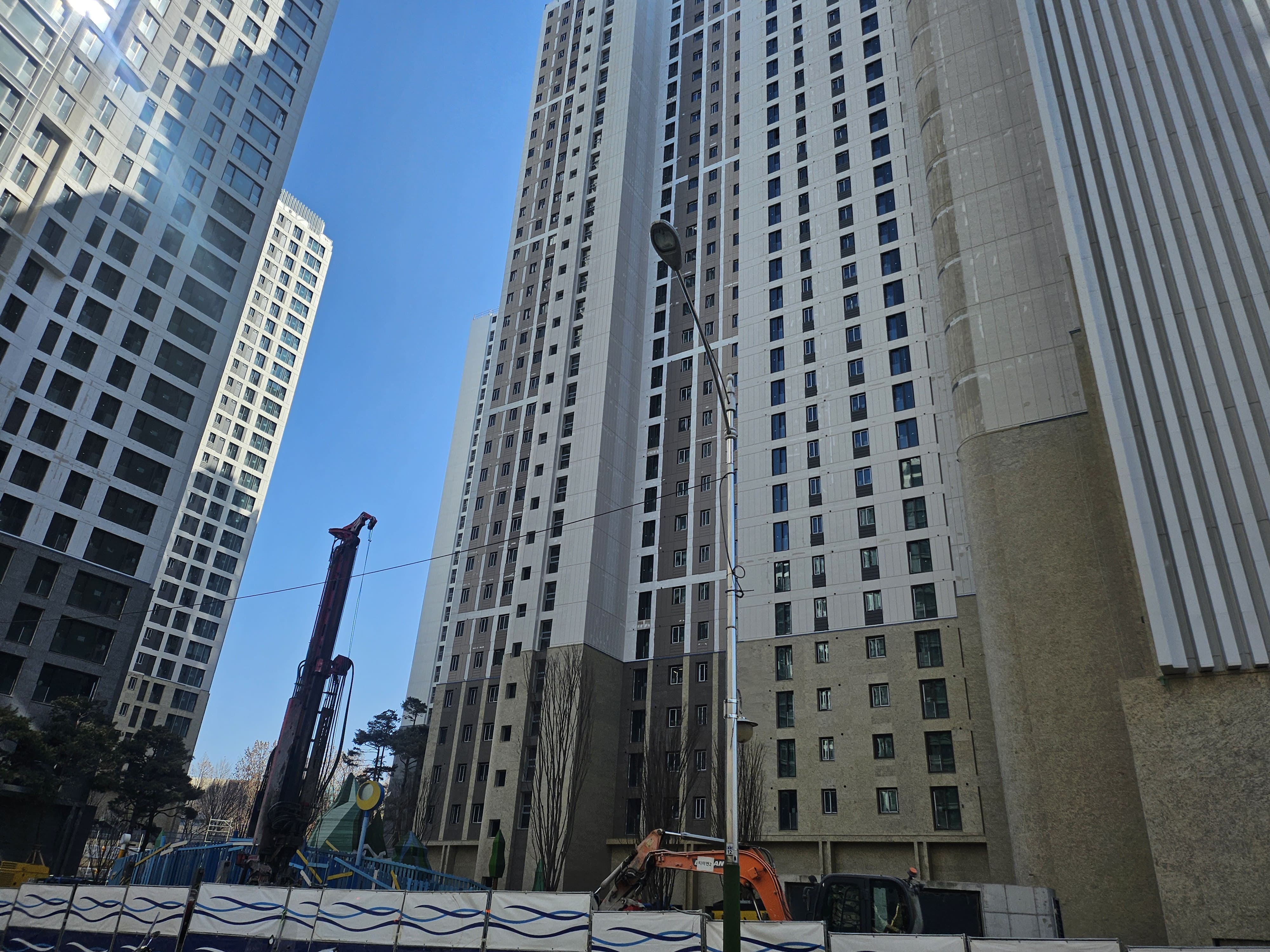 대부분의 외벽 공사는 완료되었고, 문주 공사가 한창이었습니다. 아파트 실내도 작업이 진행 중임을 알 수 있었습니다.