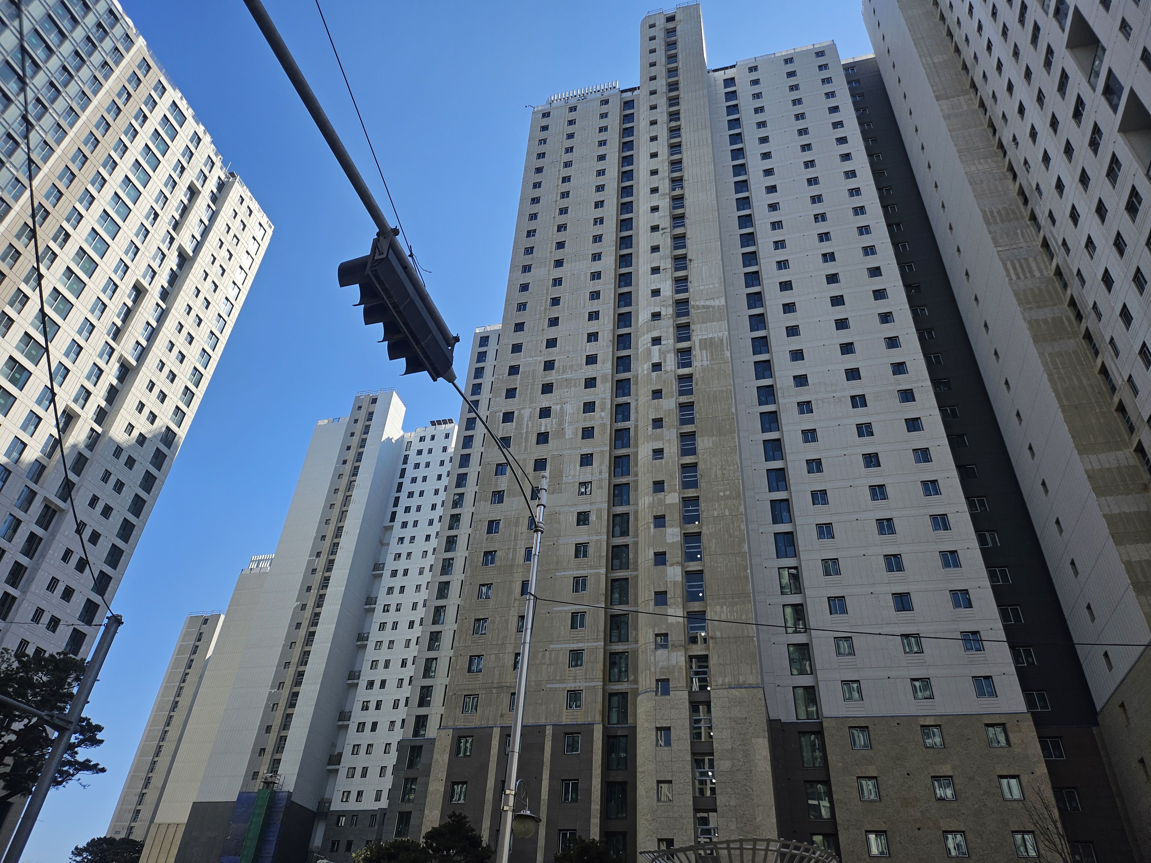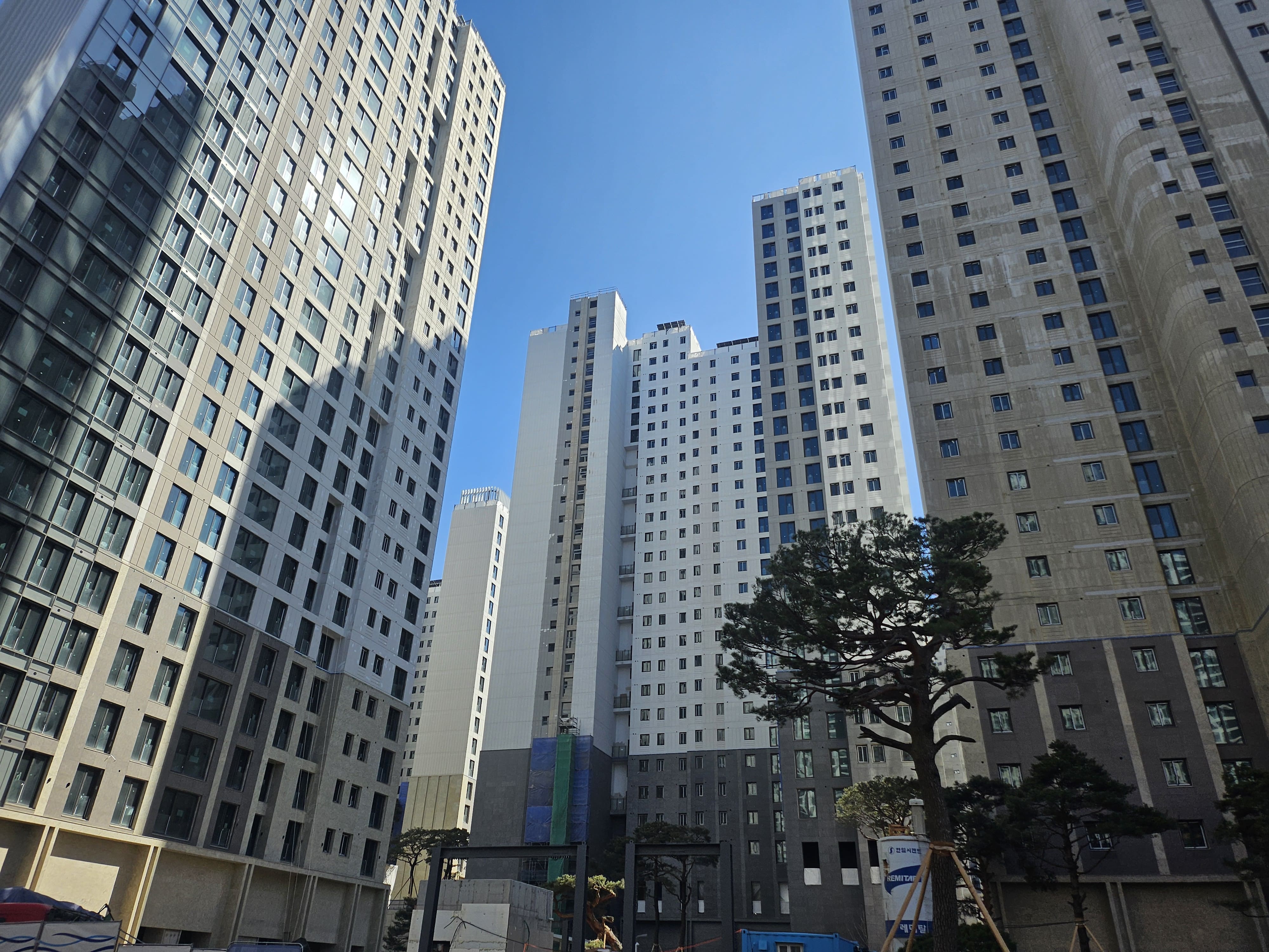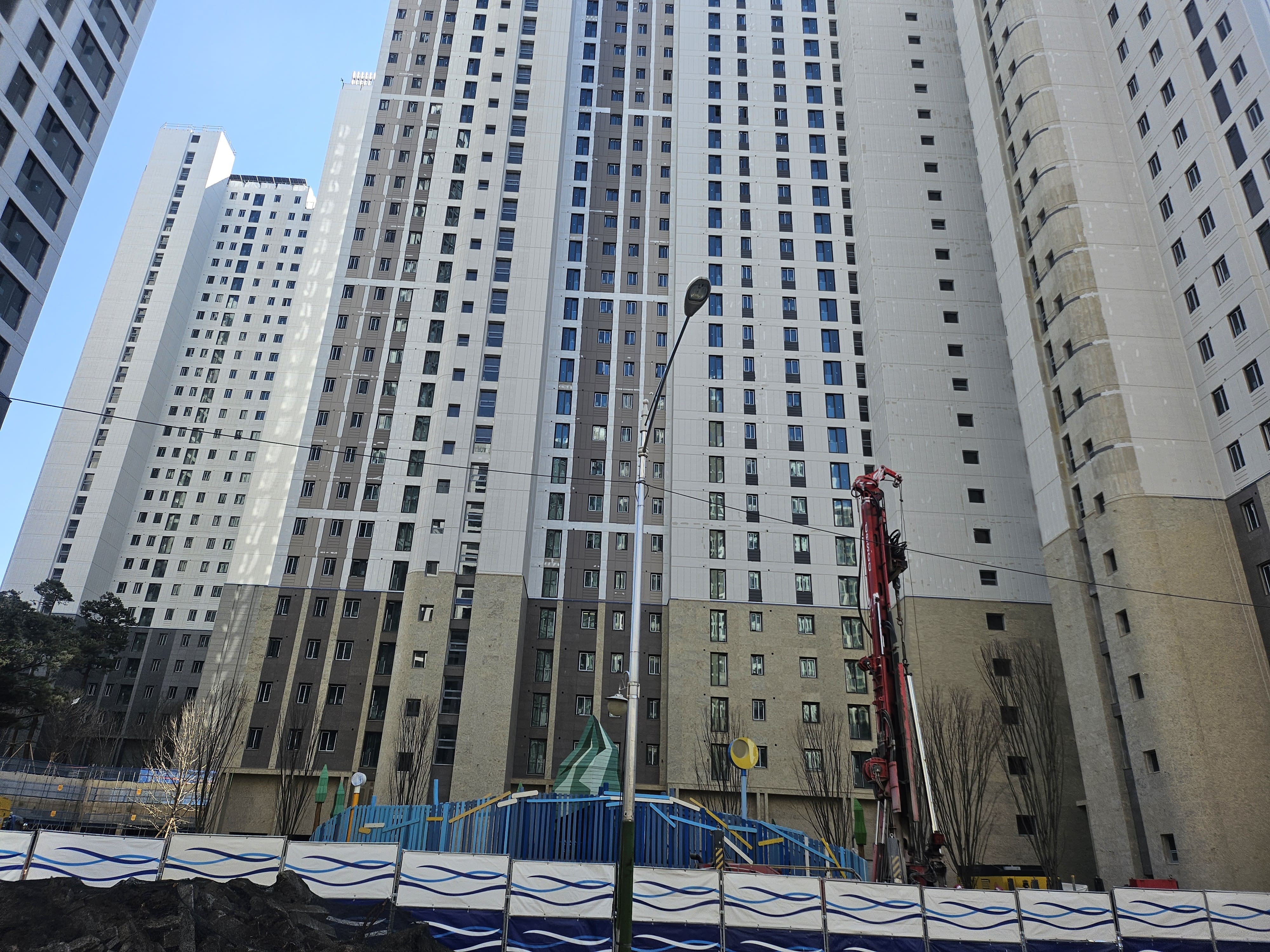 대부분의 외벽 공사는 완료되었고, 문주 공사가 한창이었습니다. 아파트 실내도 작업이 진행 중임을 알 수 있었습니다.
