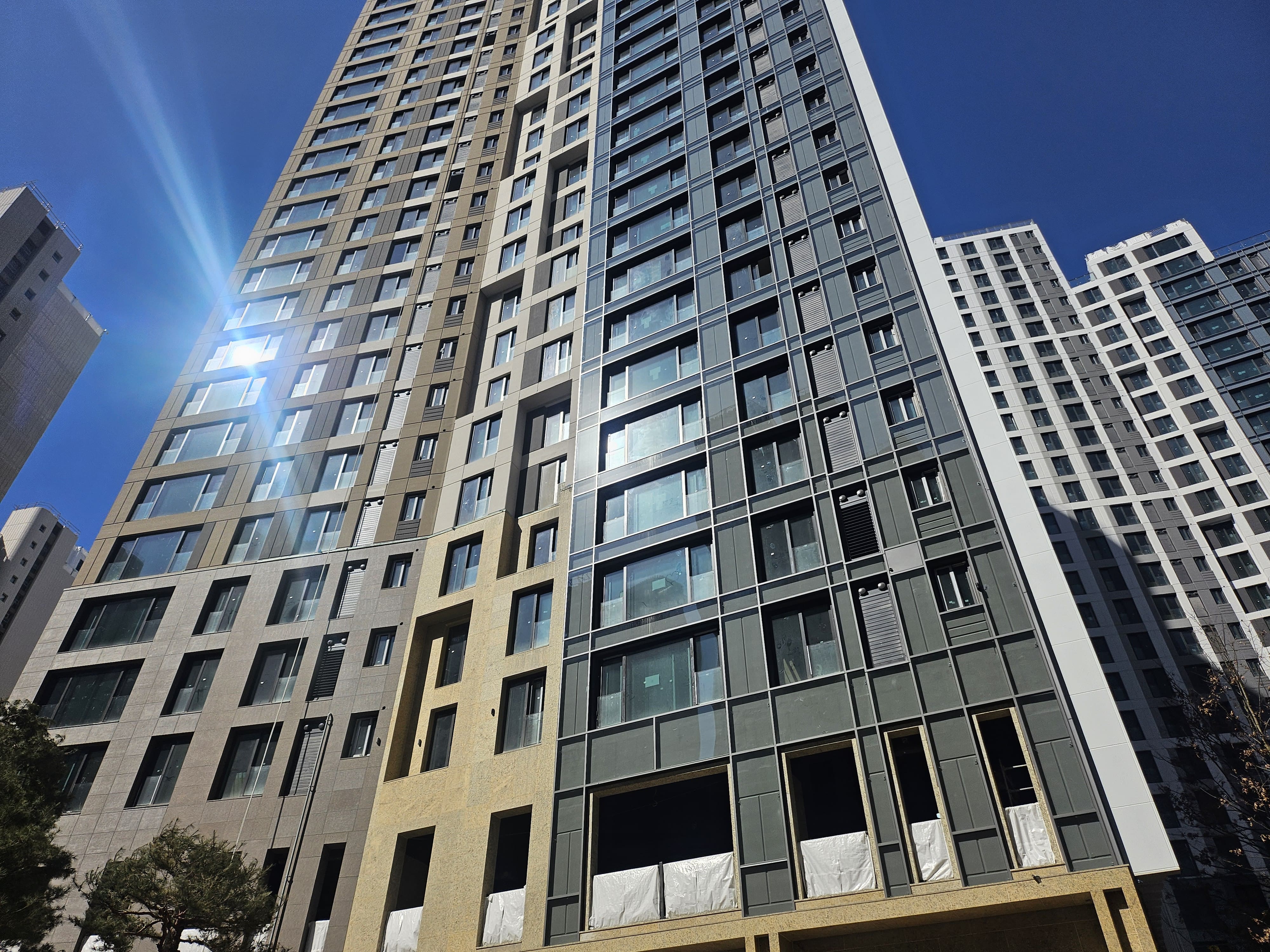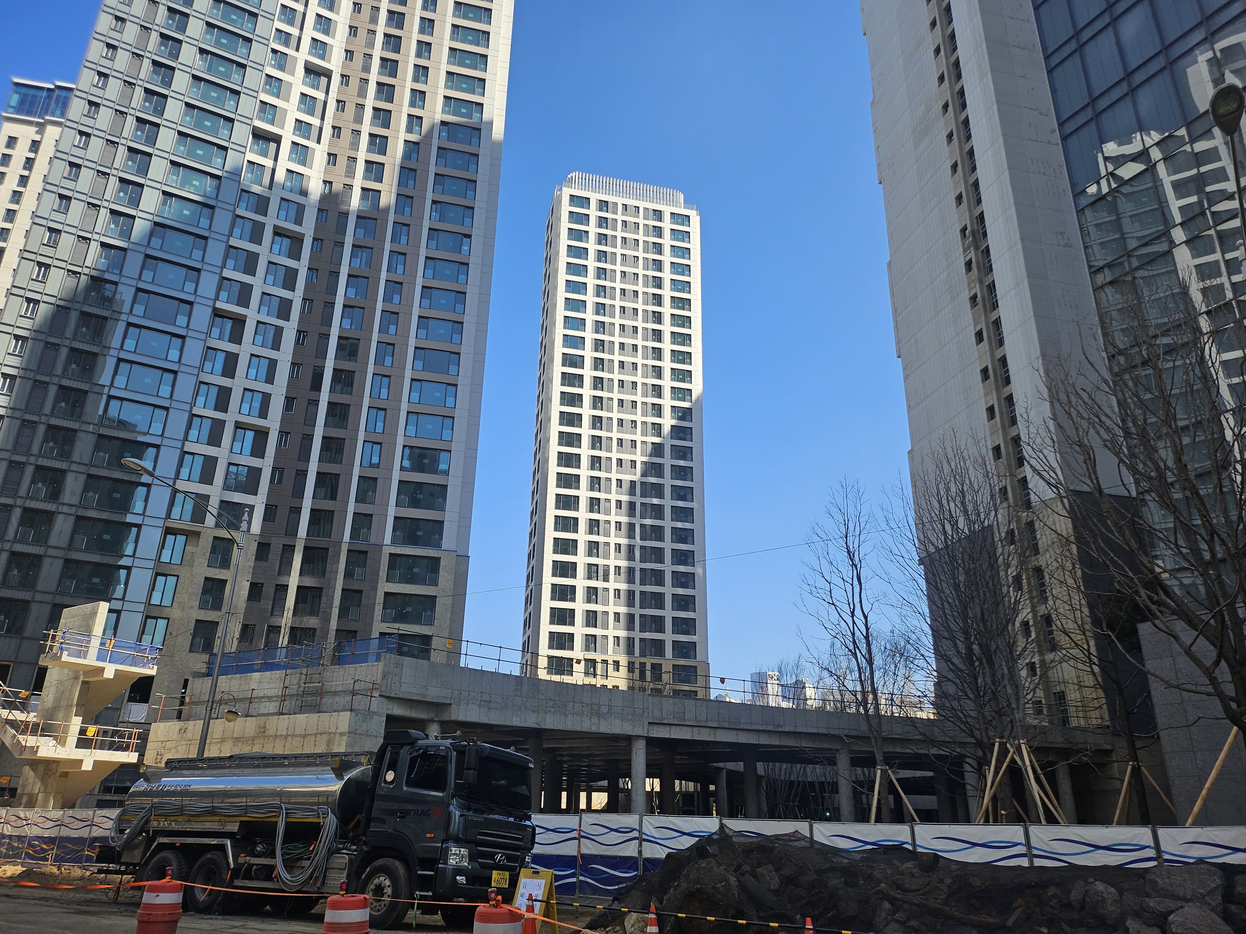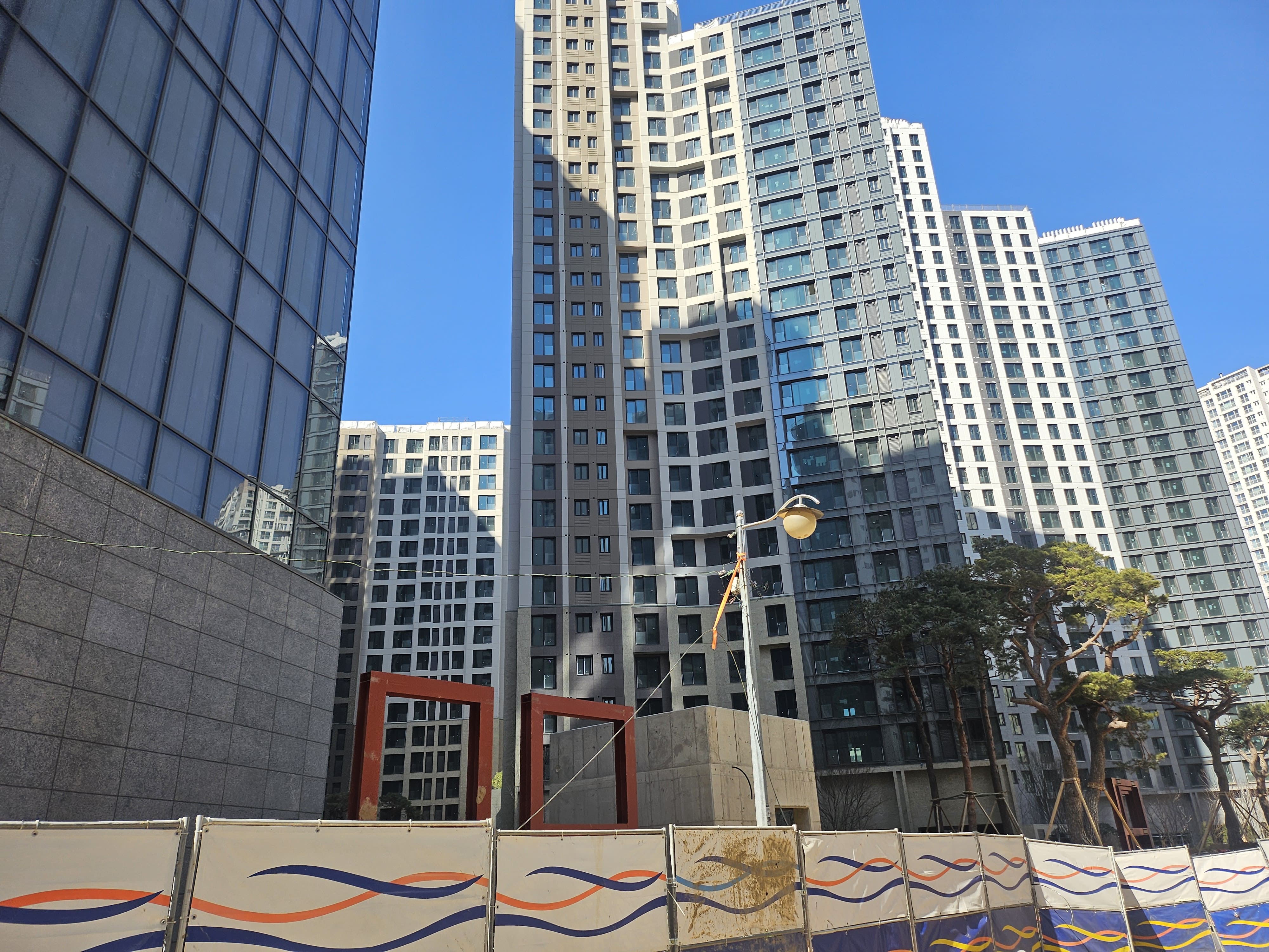 대부분의 동들이 외벽공사는 완료되어서 커튼월이 완성된 것을 확인하였습니다. 외벽 외칠도 완료되어서, 상당히 고급스러운 아파트임을 알 수 있었습니다.