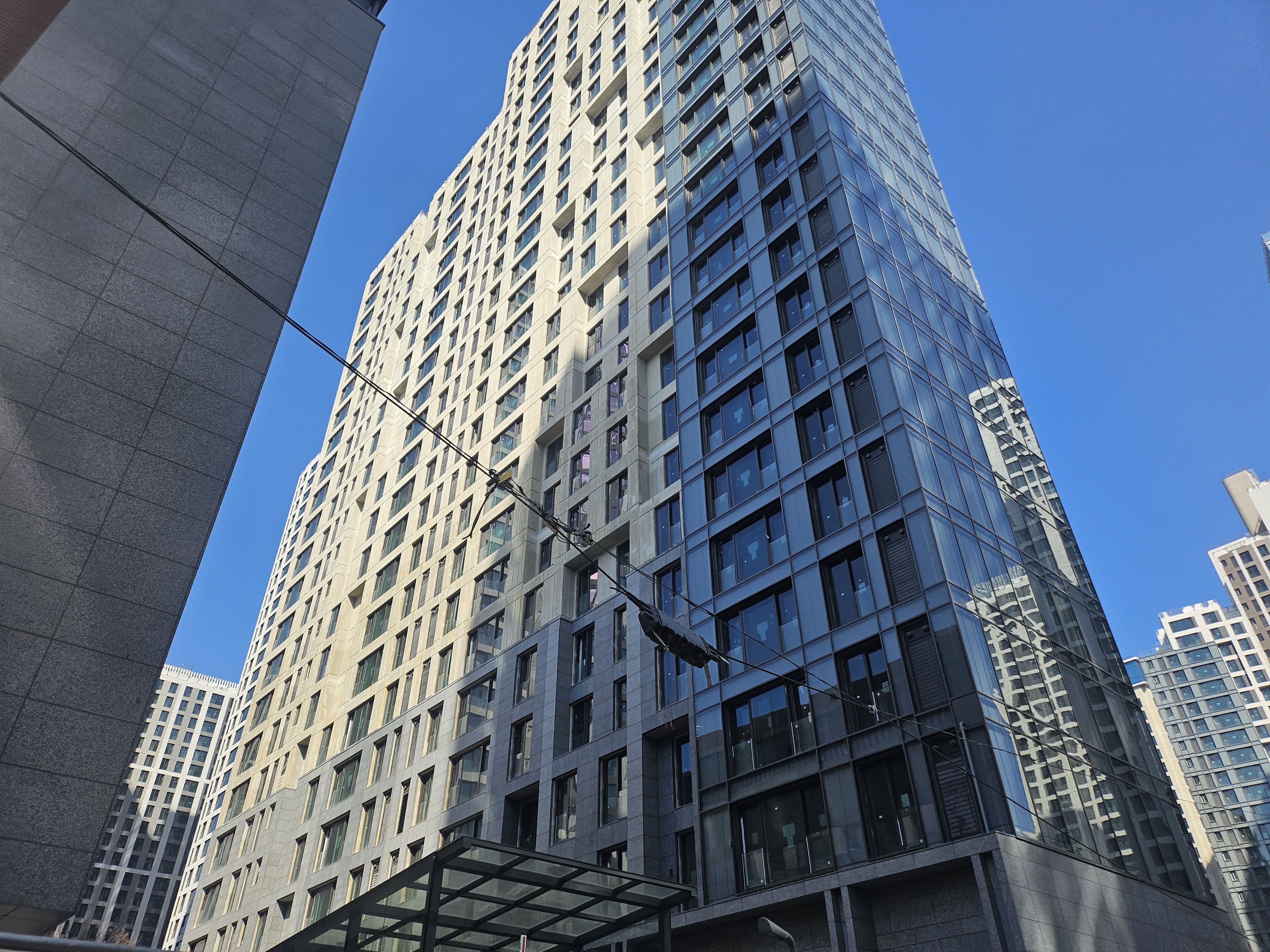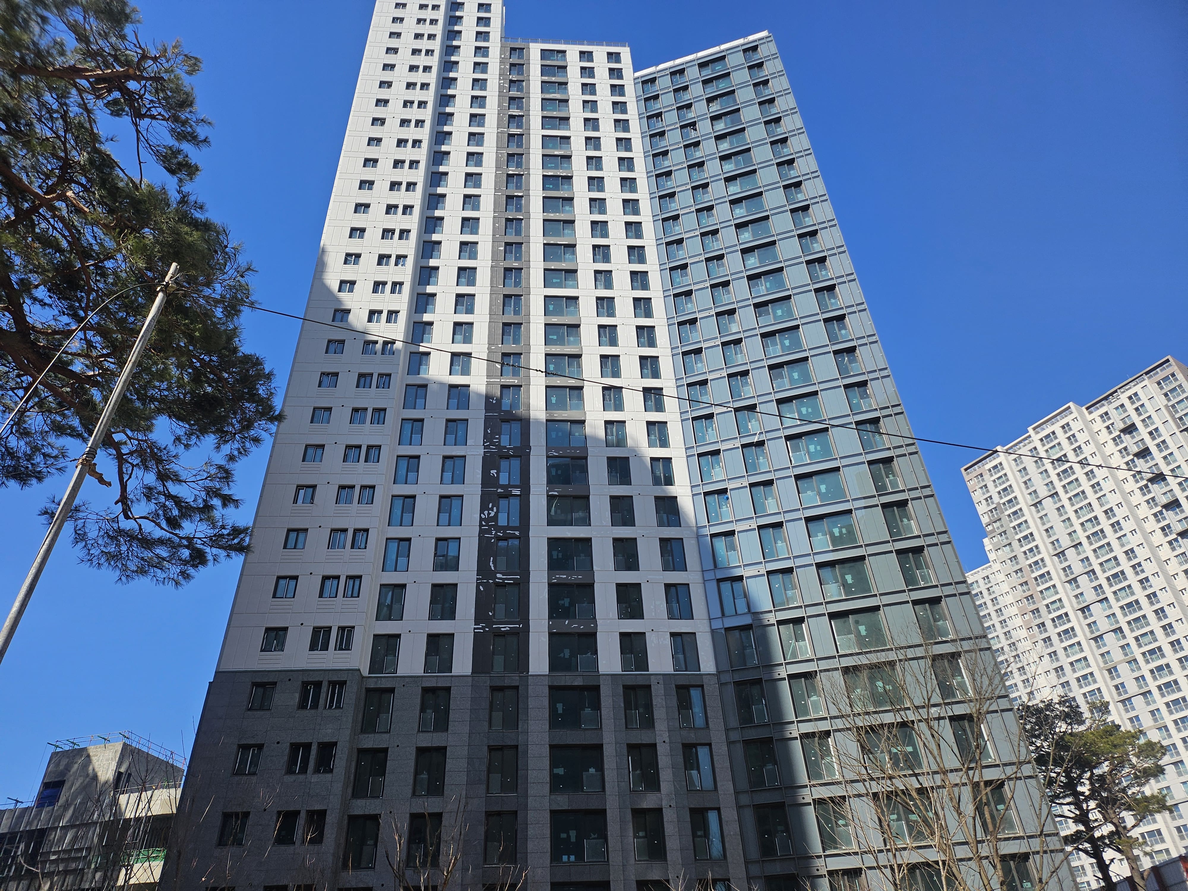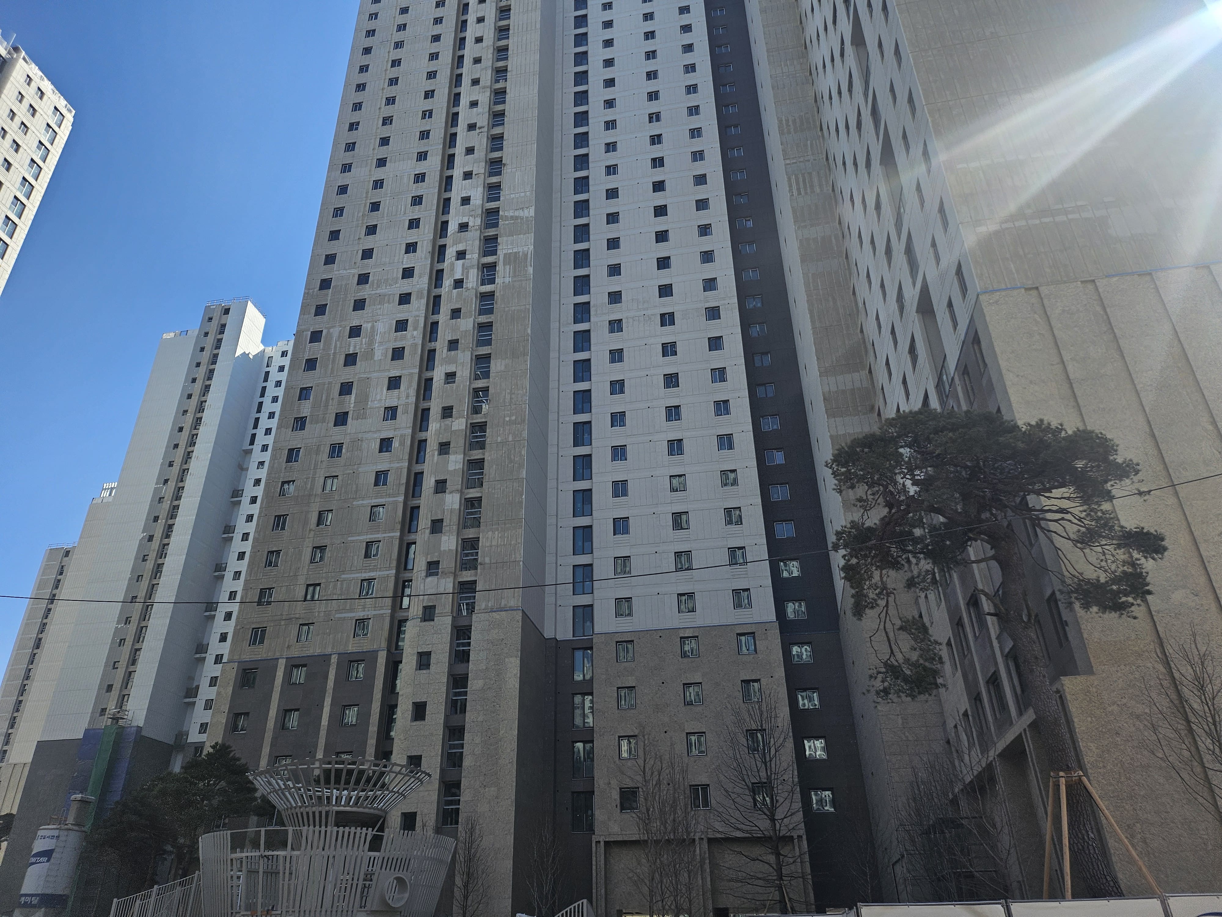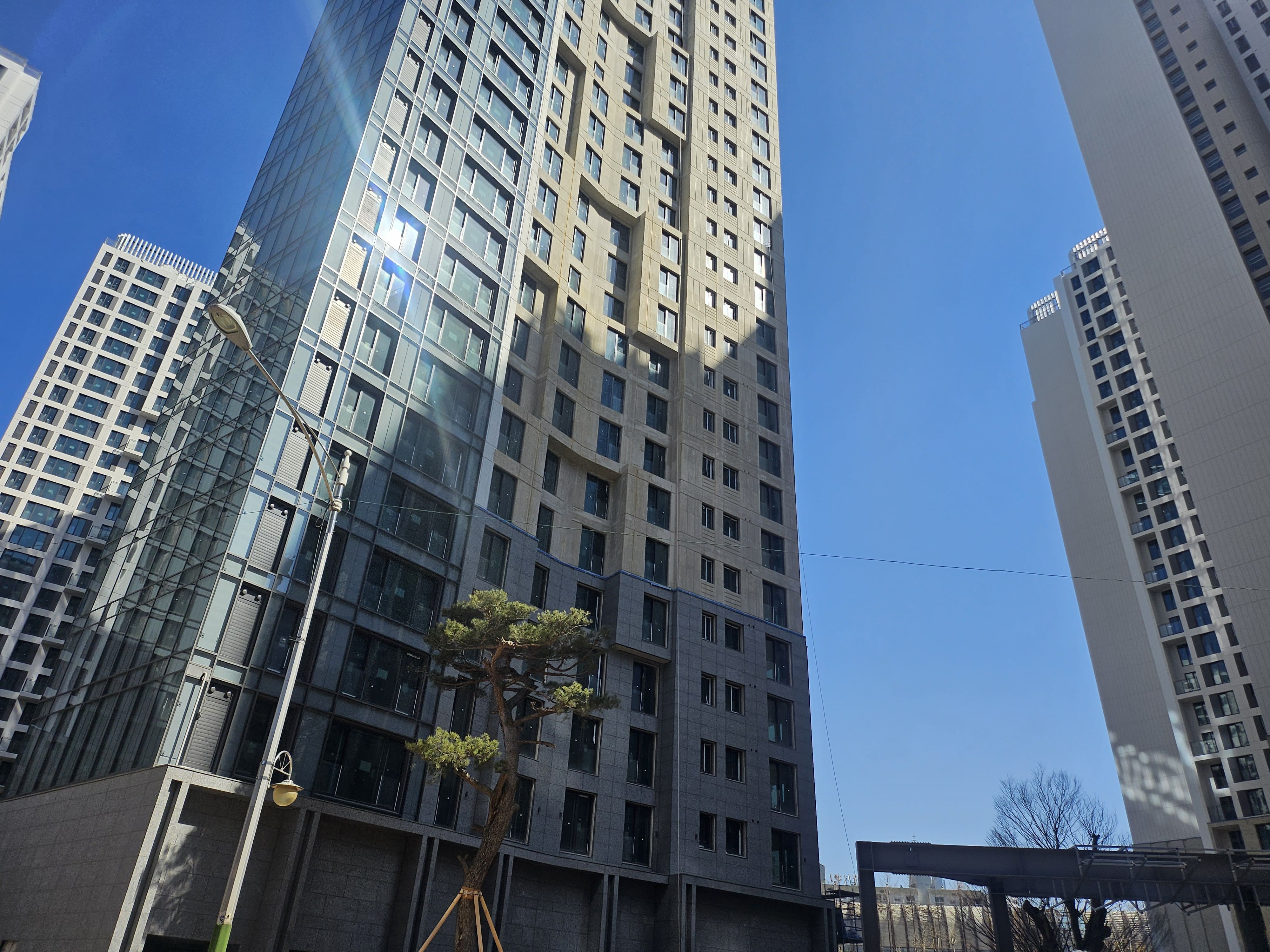 대부분의 동들이 외벽공사는 완료되어서 커튼월이 완성된 것을 확인하였습니다. 외벽 외칠도 완료되어서, 상당히 고급스러운 아파트임을 알 수 있었습니다.