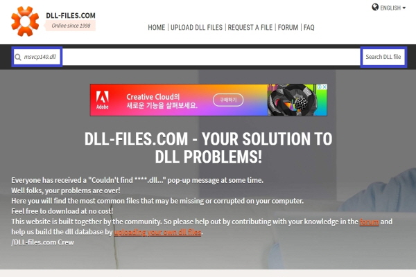 2. 검색창에 'msvcp140.dll'을 입력 후 검색 버튼(Search DLL file)을 클릭한다.