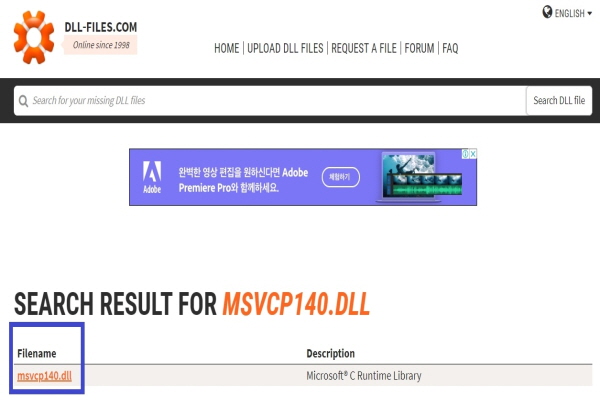 3. 검색된 Filename의 'msvcp140.dll'를 클릭한다.